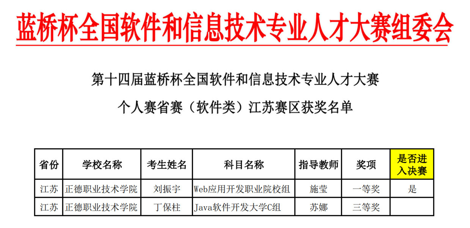 在第十四届“蓝桥杯”个人赛省赛(软件类)江苏赛区中,电子与信息技术系软件技术专业2021级学生刘振宇获省级一等奖、丁保柱获省级三等奖。其中,Web应用开发项目为天博体育 首次参赛,获得历史性的突破,并闯入全国总决赛。
