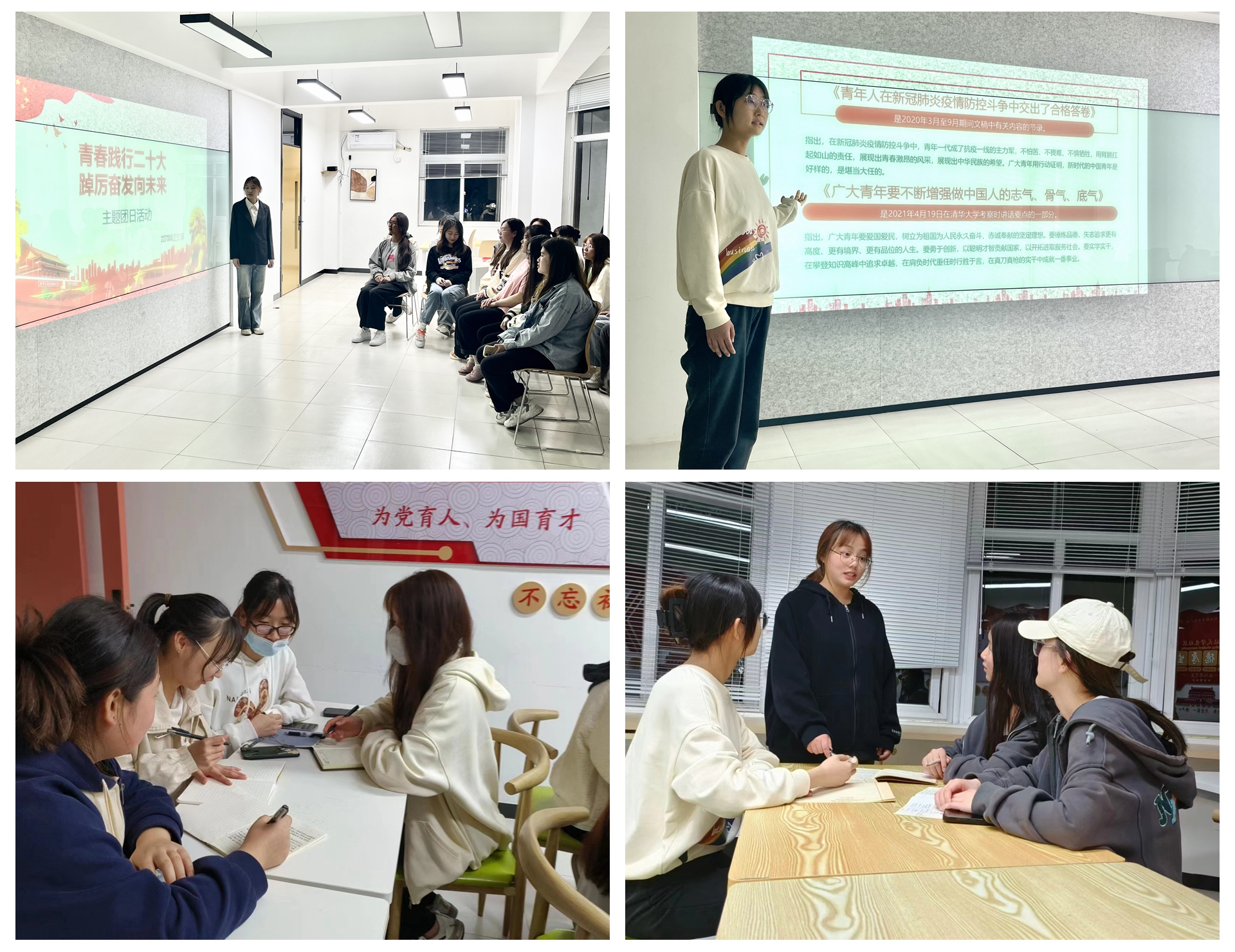 本次团日活动共分为三个部分。前期,4月9日—16日,采用各团支部书记领学,团支部成员集中学习习近平总书记《论党的青年工作》和系列关于青年、教育重要讲话视频并开展座谈交流会的方式,让学生能够深入学,系统学。“听党话、跟党走”是我们这个时代永不褪色的主题,在座谈会上,同学们畅所欲言,同学们纷纷表示,在二十大精神的指引下,将坚持在干中学、学中思、思中悟,把所思所学所悟融入实际学习和工作中,尽快成长为善学习、敢吃苦、能奉献的青年学生。