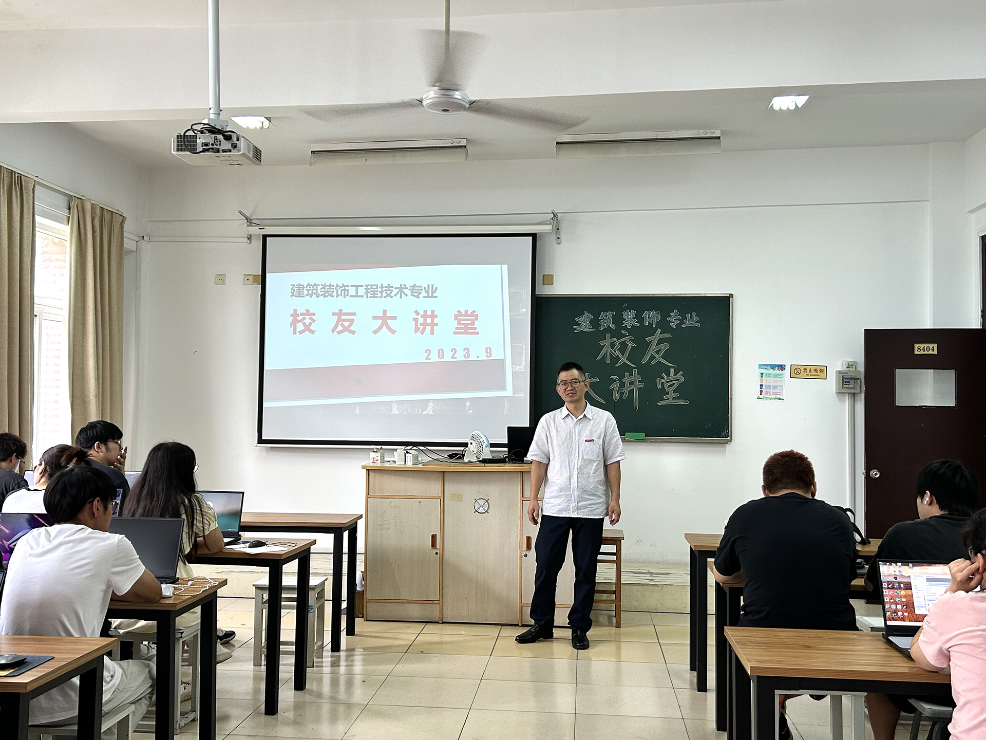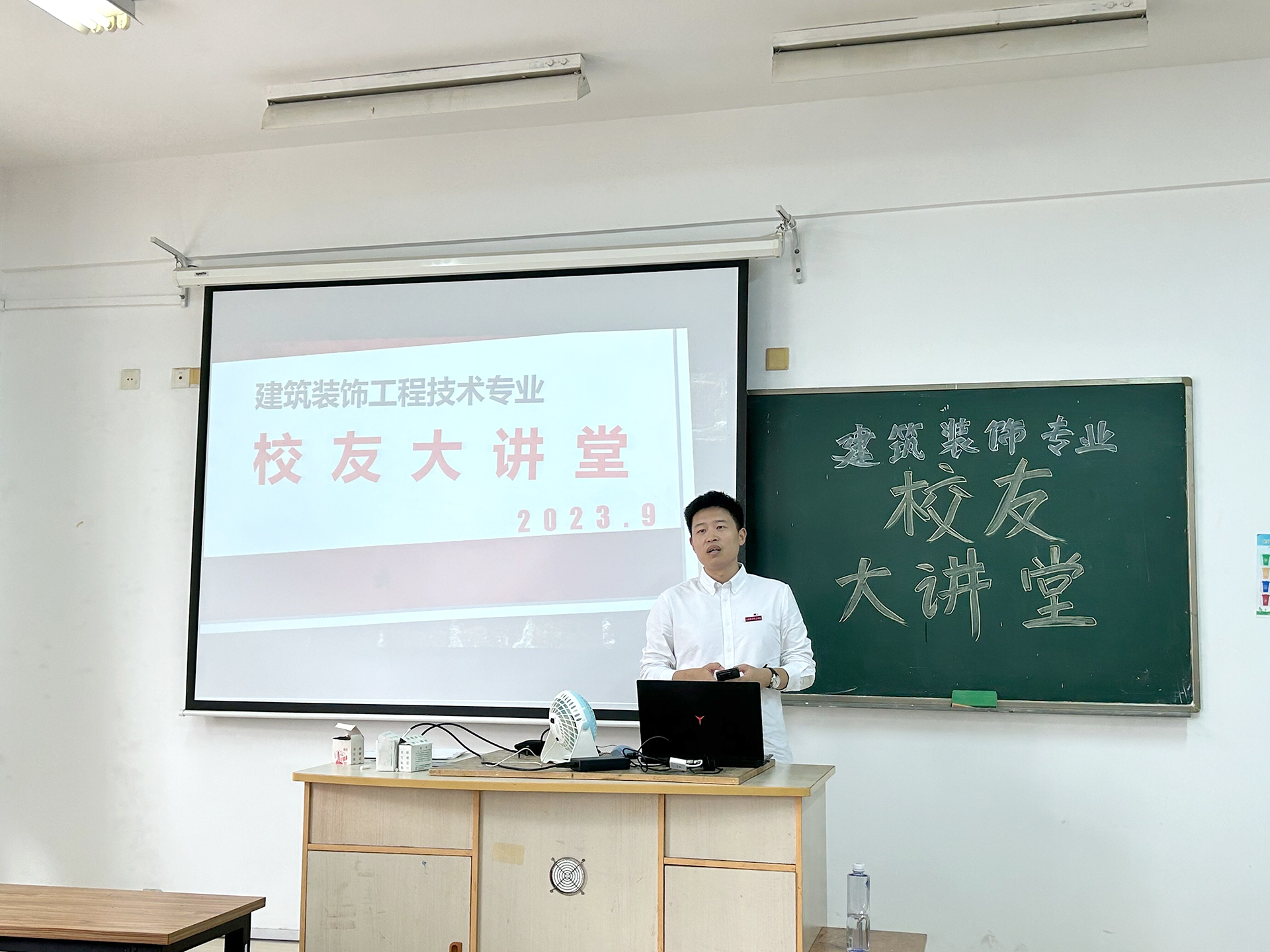 9月15日上午,作为校友代表应邀参加天博体育 2023级新生开学典礼的学长牛海涛来到艺术设计与建筑工程系的建筑装饰工程技术专业班级课堂,为学弟学妹们上了一次生动的专业课。由冯显静老师主持本期校友大讲堂活动。牛海涛作为艺建系校友大讲堂第三期的主讲人,在课堂上与同学们近距离交流,分享了自己毕业十年的职业成长经历和个人心得。