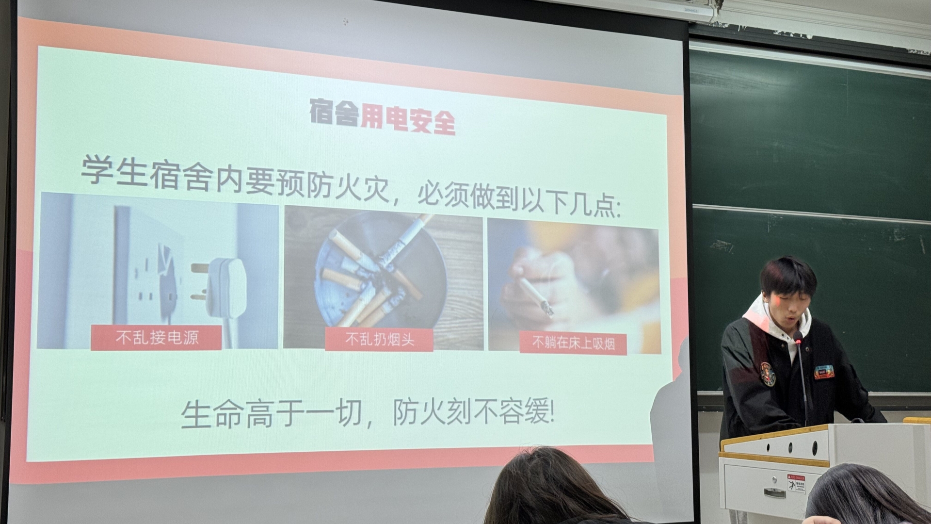 在班会的最后,王露洋通过展示宿舍易发生火灾的物品摆放、违规电器等,给大家做出安全提醒。通过此次班会,同学们不仅了解了消防安全知识,还学会了如何将这些知识应用到日常生活中。我们相信,只有每个人都认真对待消防安全,才能共同创造一个更加安全的生活环境。
