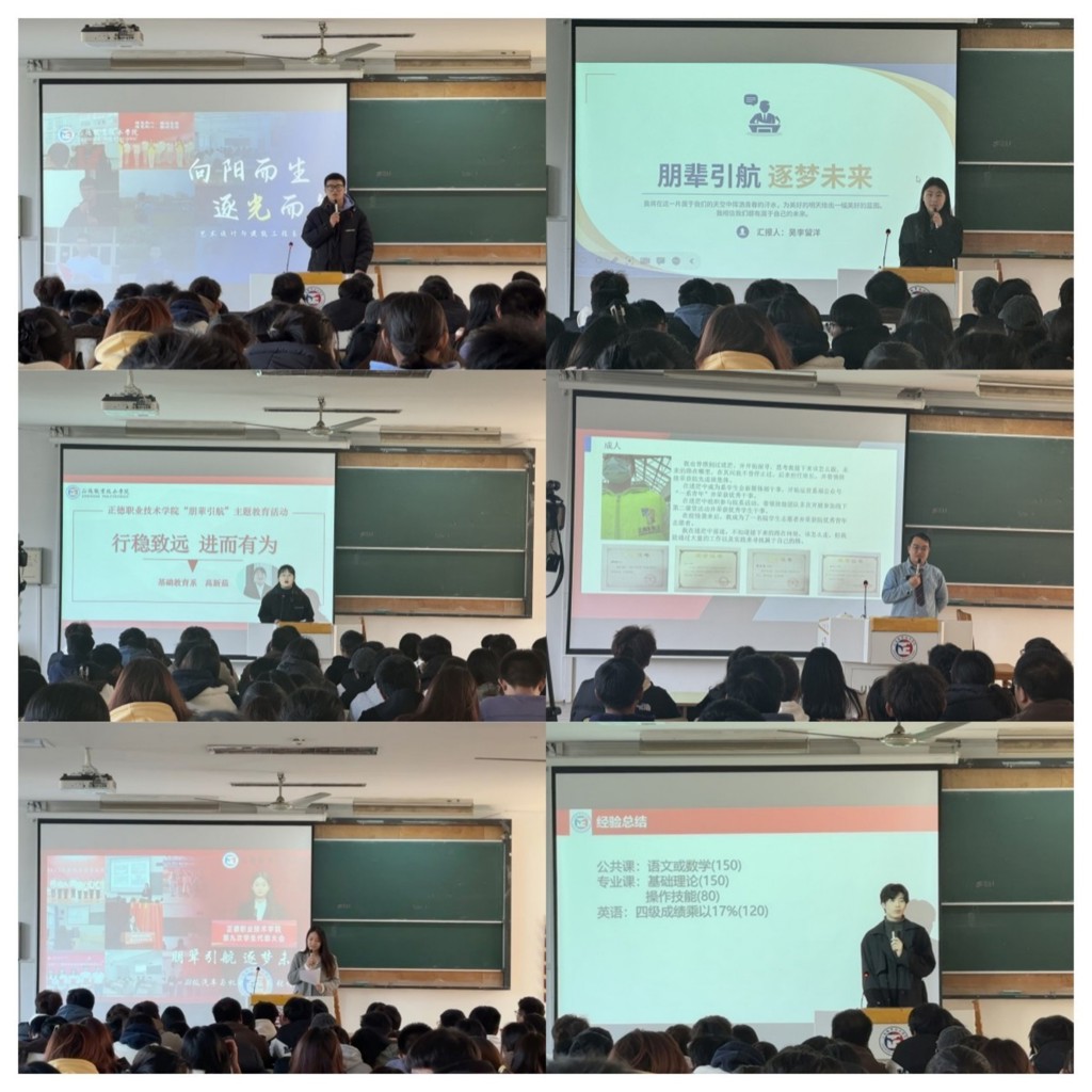 电子与信息技术系戴立志以《躬身践行,强国有我》为题,以“成人”“成才”“成功”三个关键词为大家分享了他的成长体验;基础教育系高新茹以《行稳致远,进而有为》为题,通过思想、学习、实践、工作四个方面,展示出不一样的成长历程;经济与管理系吴李留洋以《朋辈引航,逐梦未来》为题,鼓励学弟学妹们利用课余时间积极参与校内外各类社会志愿服务活动,践行志愿精神,贡献青春力量;民用航空系薛升以《我的学习宝典》为题,分享了自己成功转本的学习方法,激励同学们坚定目标,认真对待每一天,在拼搏中不断超越自我;汽车与机电工程系张诗琦以《朋辈引航,逐梦未来》为题,向大家讲述了她自己对如何做一个有理想、敢担当、能吃苦、肯奋斗的正德好青年的理解;艺术设计与建筑工程系袁江涛以《向阳而生,逐光而行》,激励同学们树立梦想勤奋学习,让增长本领成为青春搏击的能量。