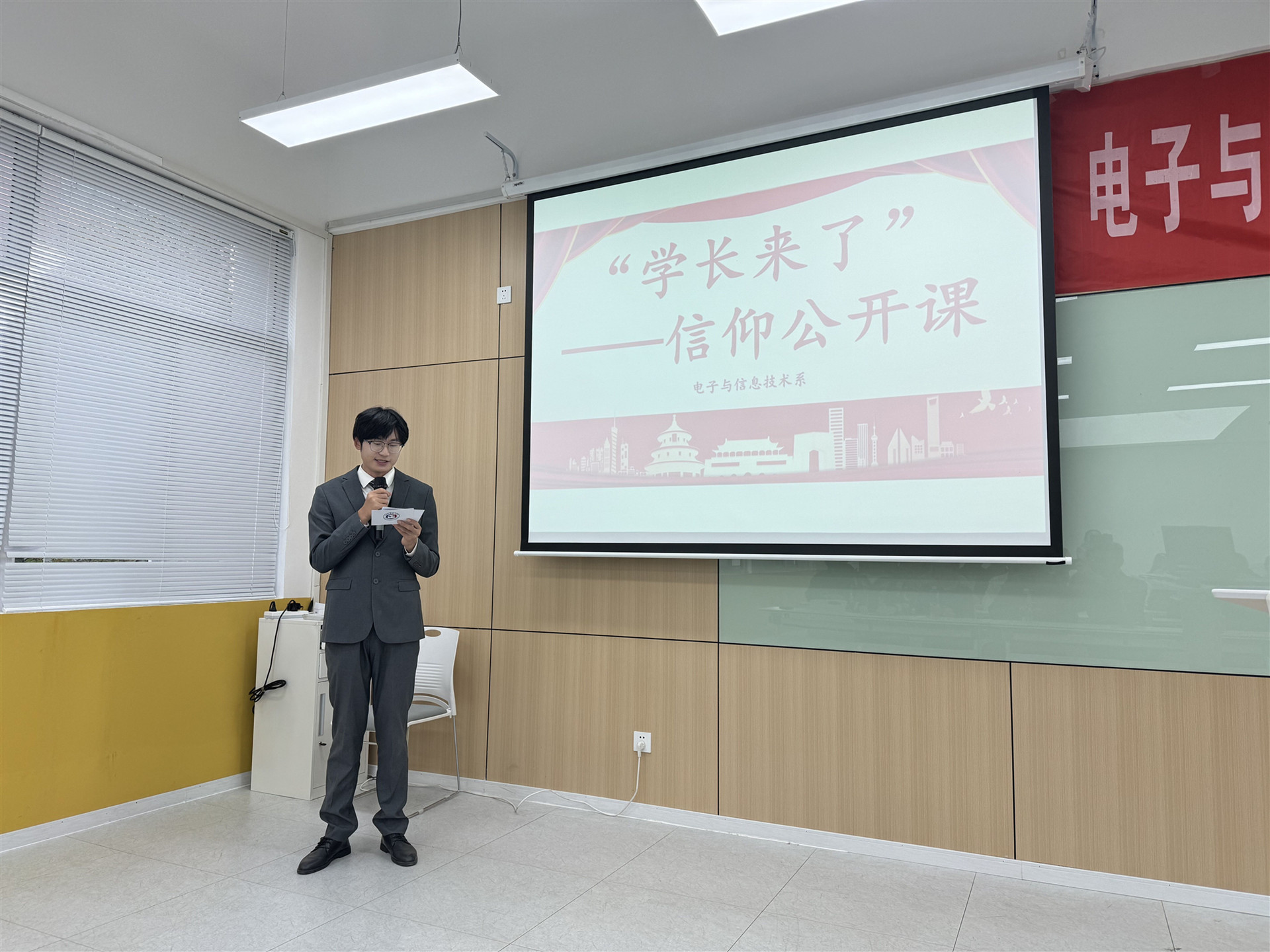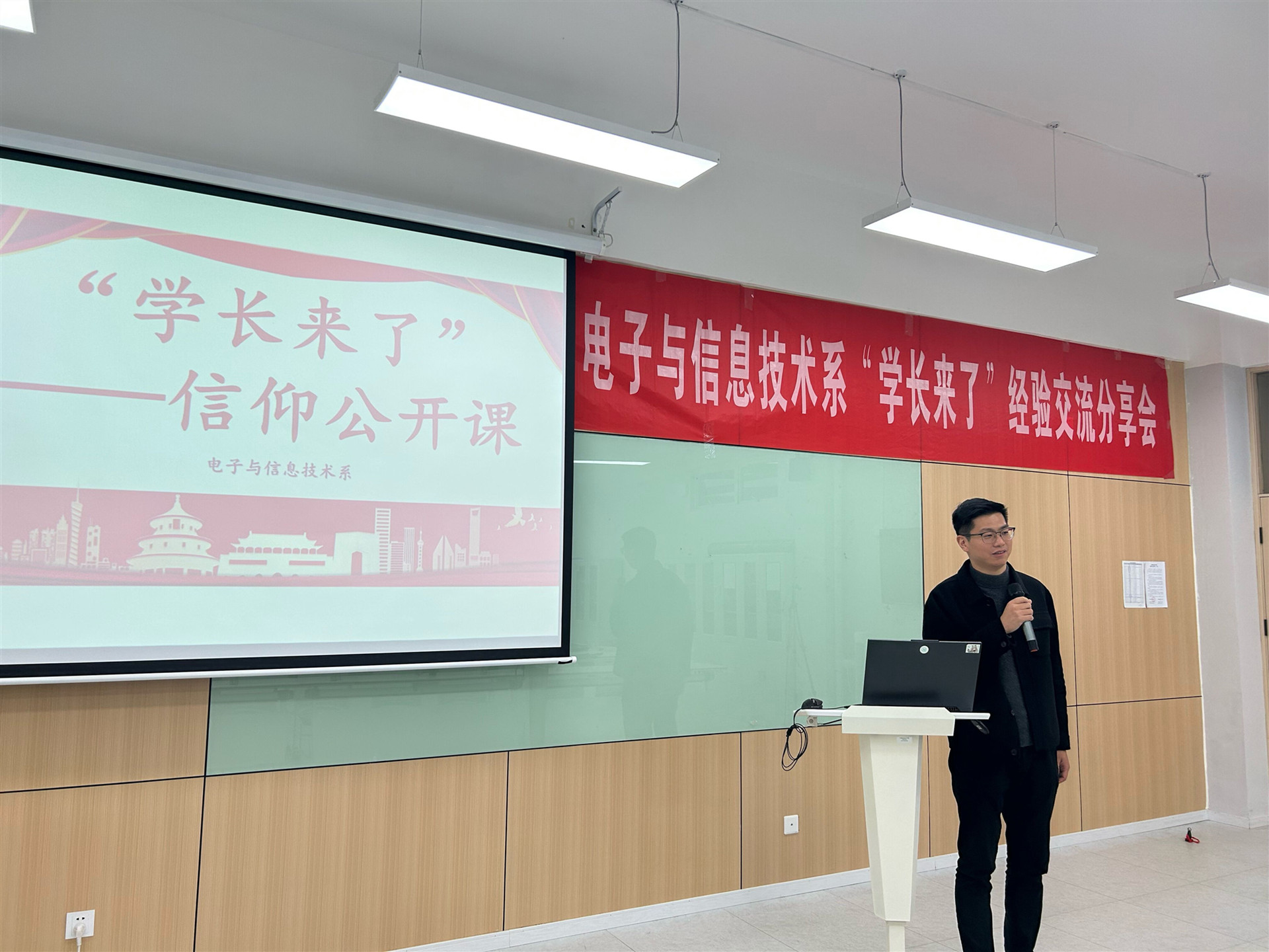 为深入学习贯彻党的二十大精神和团十九大报告,引导青年学生进一步坚定理想信念,扎实推进习近平新时代中国特色社会主义思想主题教育走深走实,11月23日,电子与信息技术系在教学楼9205开展“学长来了”信仰公开课暨青春故事分享会。电子与信息技术系党支部书记赵欣,团总支书记、辅导员何华智,辅导员付磊及2022级、2023级学生代表全程参与本次活动。活动由学生代表石增光主持。
