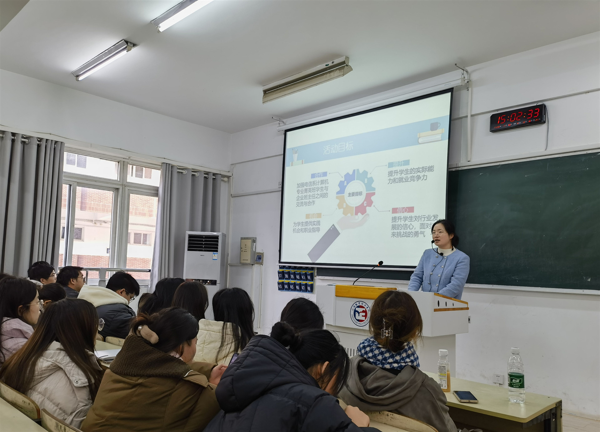 2023年11月30日下午,电子与信息技术系在教学楼2205成功举办计算机菁英班交流会。本次交流会旨在落实立德树人根本任务,优化人才培养方案,推进校企合作深层发展,提高学生的创新能力与实践能力。南京竹影数字科技有限公司总经理范玉峰、技术总监于华贵,南京锋云聚信息科技有限公司总经理张林炜应邀参加交流会,电子与信息技术系专任教师张韬、胡磊、陈锦锦、余爱华、苏娜,辅导员王雯等全程陪同交流。交流会由陈锦锦主持。