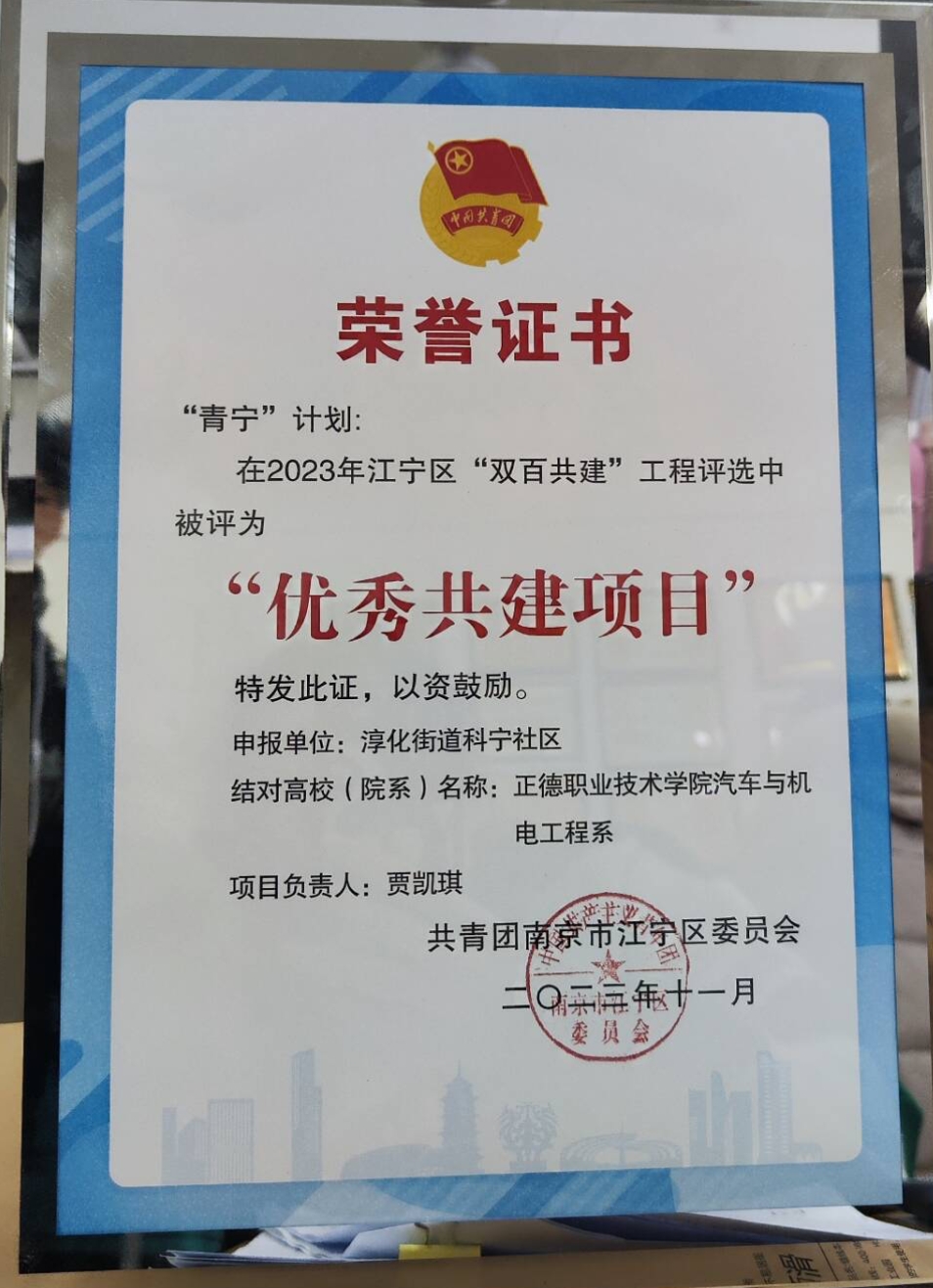 “双百共建”工程通过联动社区与高校,完善实践资源共享制度,推动青年在实践教育中实现与城市的双向奔赴。汽车与机电工程系荣获共青团南京市江宁区“优秀共建项目”。