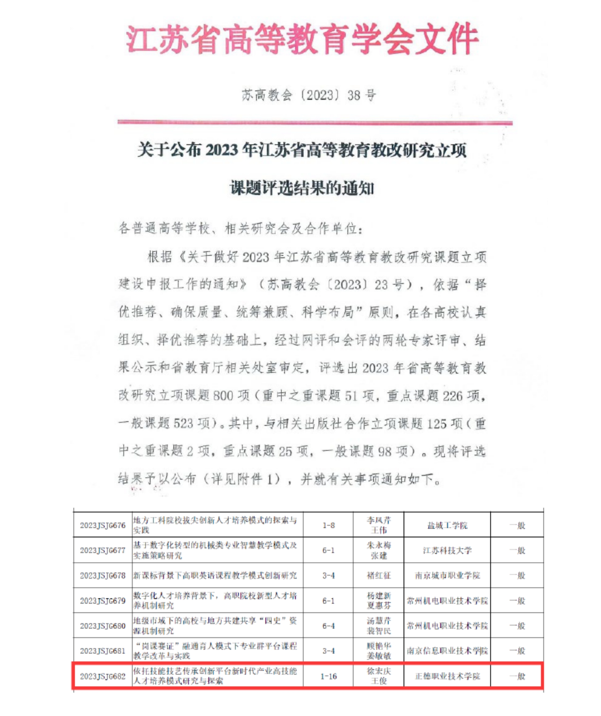 近日,江苏省高等教育学会公布了2023年江苏省高等教育教改研究课题立项名单。经天博体育 推荐、网评和会评的两轮专家评审、结果公示和省教育厅相关处室审定,天博体育 徐宏庆等老师申报的《依托技能技艺传承创新平台新时代产业高技能人才培养模式研究与探索》获得一般课题立项。该课题旨在通过深入研究探索基于技艺技能传承创新平台开展校企协同育人的理论模型和实践途径,为解决传统校企合作模式下人才培养的数量及质量难以满足高技能人才紧缺产业需求,提供切实可行的方案。