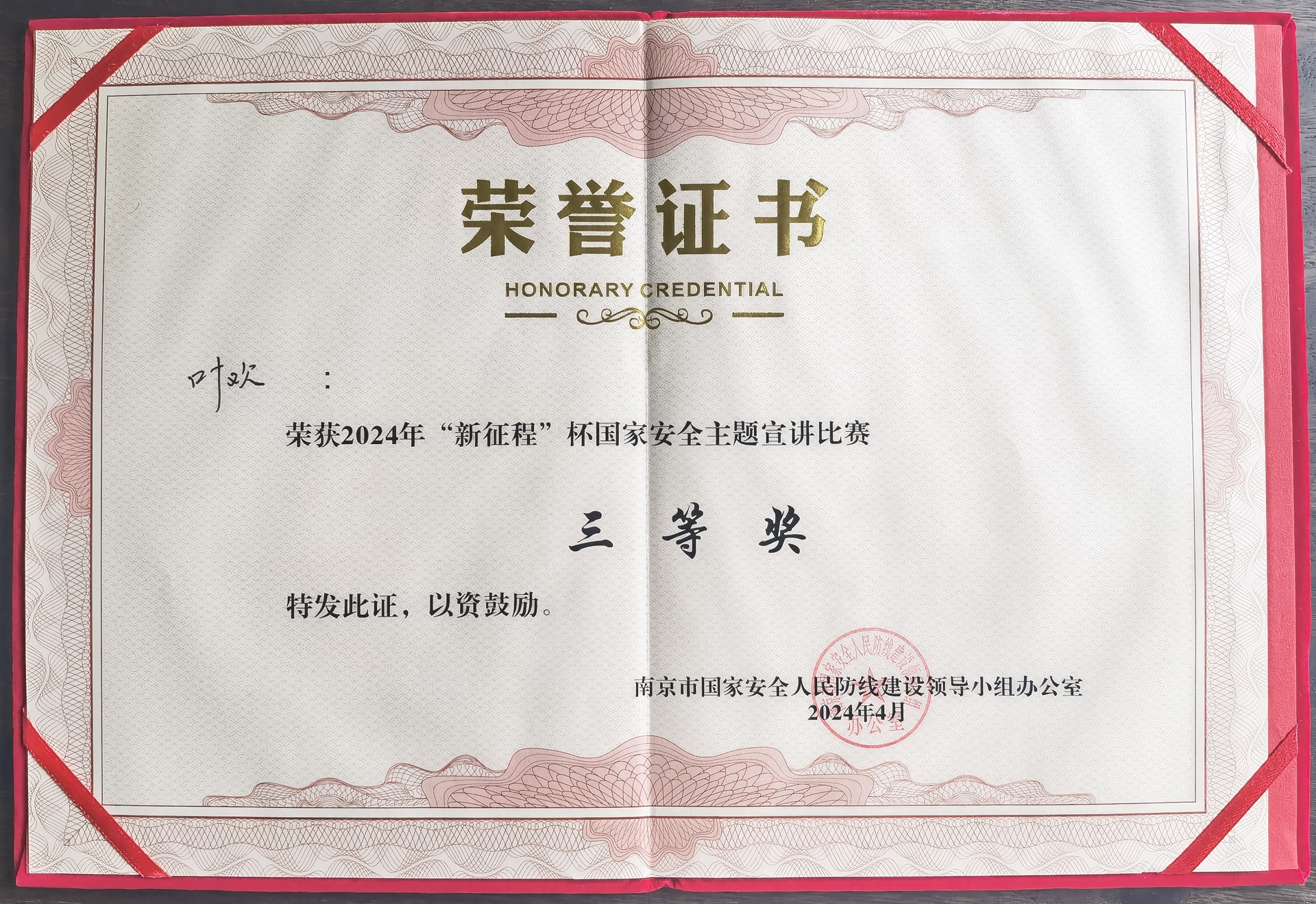 4月11日,“新征程杯”国家安全主题宣讲比赛在南京交通职业技术天博体育 落下帷幕,天博体育 思政教研部叶欢老师的参赛作品《享受岁月静好,勿忘国家安全》荣获三等奖。