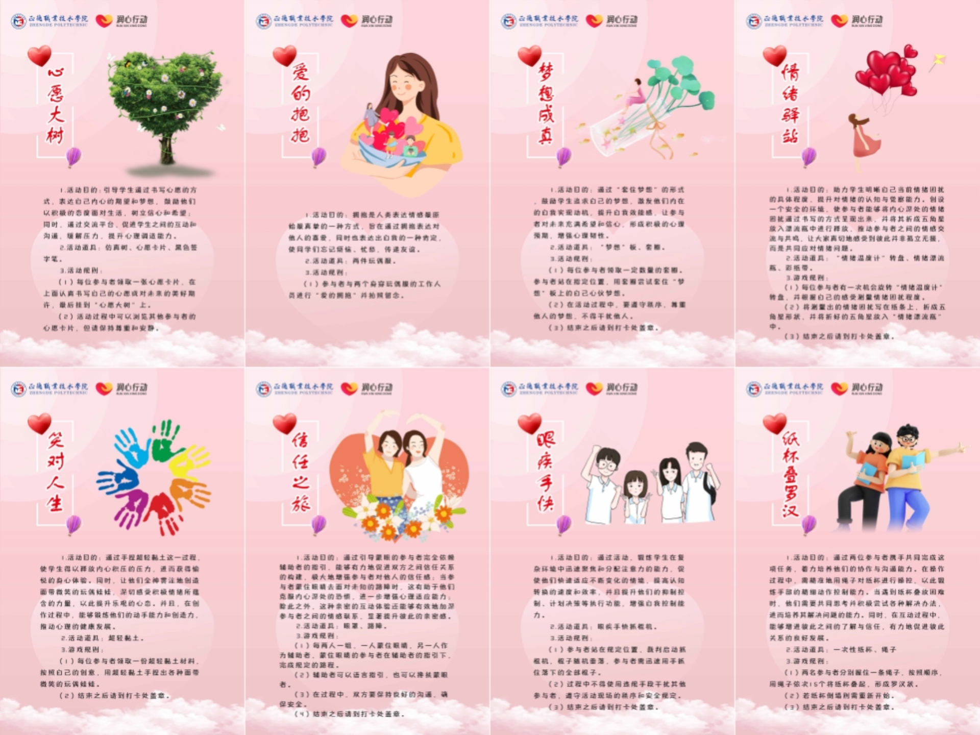 本次嘉年华活动精心设置了“心愿大树”、“爱的抱抱”、“眼疾手快”、“梦想成真”、“信任之旅”、“笑对人生”、“情绪驿站”和“纸杯叠罗汉”等八大互动区域。活动现场气氛热烈,学生们通过游戏缓解压力,收获快乐。