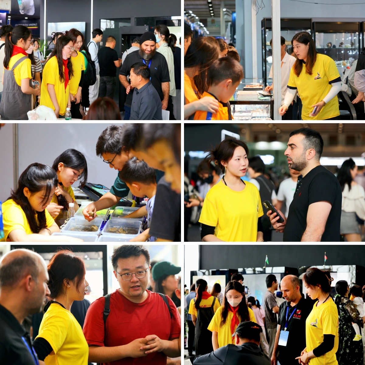 大会准备阶段,院团委通过活动宣传、组织招募、培训动员、岗位指导等环节,对志愿者进行赛前培训,为志愿服务打下了坚实的基础。博览会期间,志愿者们每天早早到达指定岗位,在招商板块区、接待区、交流大会区、特色新矿物展示区、竞拍区、展务板块、科普活动区等九大区域,随处可见天博体育 志愿者忙碌的身影。