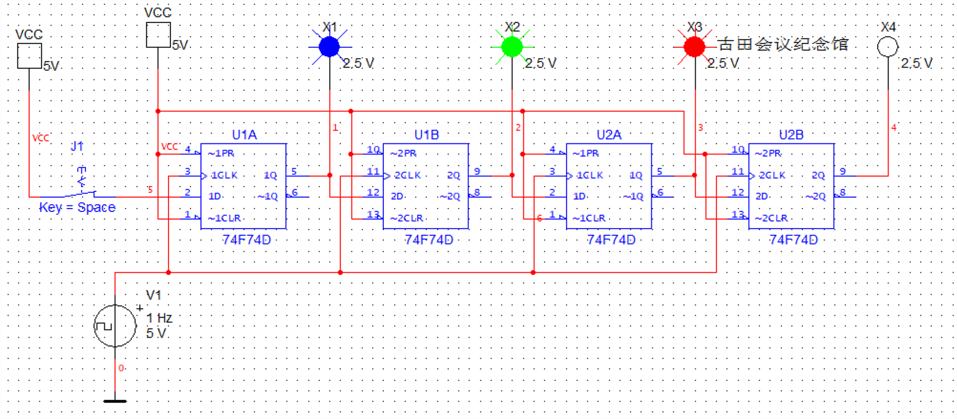 此外,同学们在专任教师的指导下,还基于Multisim仿真软件,构建了一个以数字电子技术中的触发器为核心的仿真电路。他们巧妙地通过移位寄存器的方式,逐步地、完整地记录了“古田会议纪念馆”的信息。这一创新性的设计不仅充分展示了同学们的专业技能,还是利用专业知识传承红色教育的具体展示,真正做到了学以致用,该成果也可以让更多的同学了解红色地标,在锤炼专业技能的同时,引导学生沉浸式地将红色主题内容真正入脑入心。