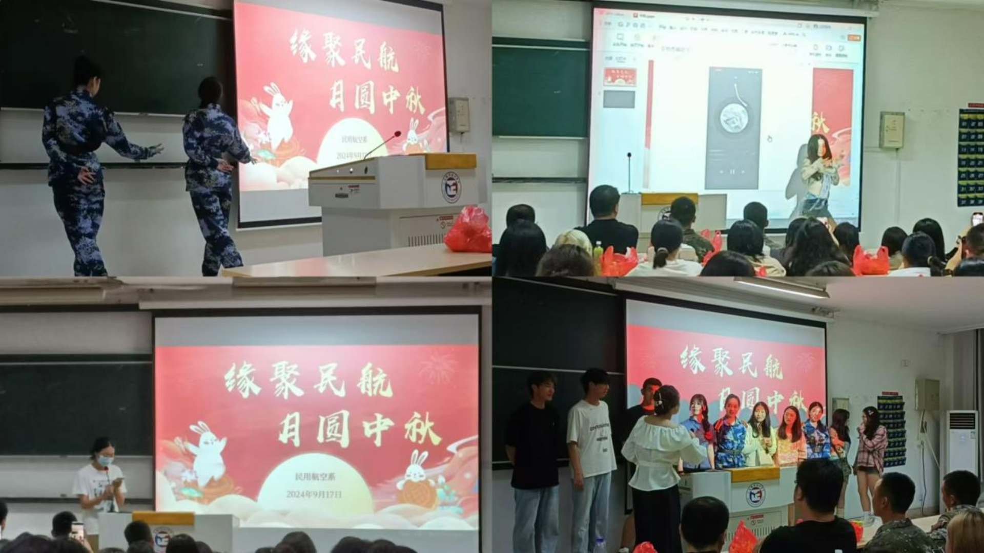 海上生明月,天涯共此时。中秋意味着团圆,节日代表着欢庆,民航系近300名新生在军训中度过此次中秋佳节。为了给新生们留下美好回忆,民用航空系于9月17日中秋当天晚18:30在1号教学搂1202、1203教室举办“缘聚民航 月圆中秋”主题新生联欢会。