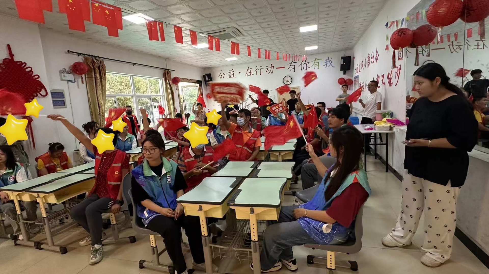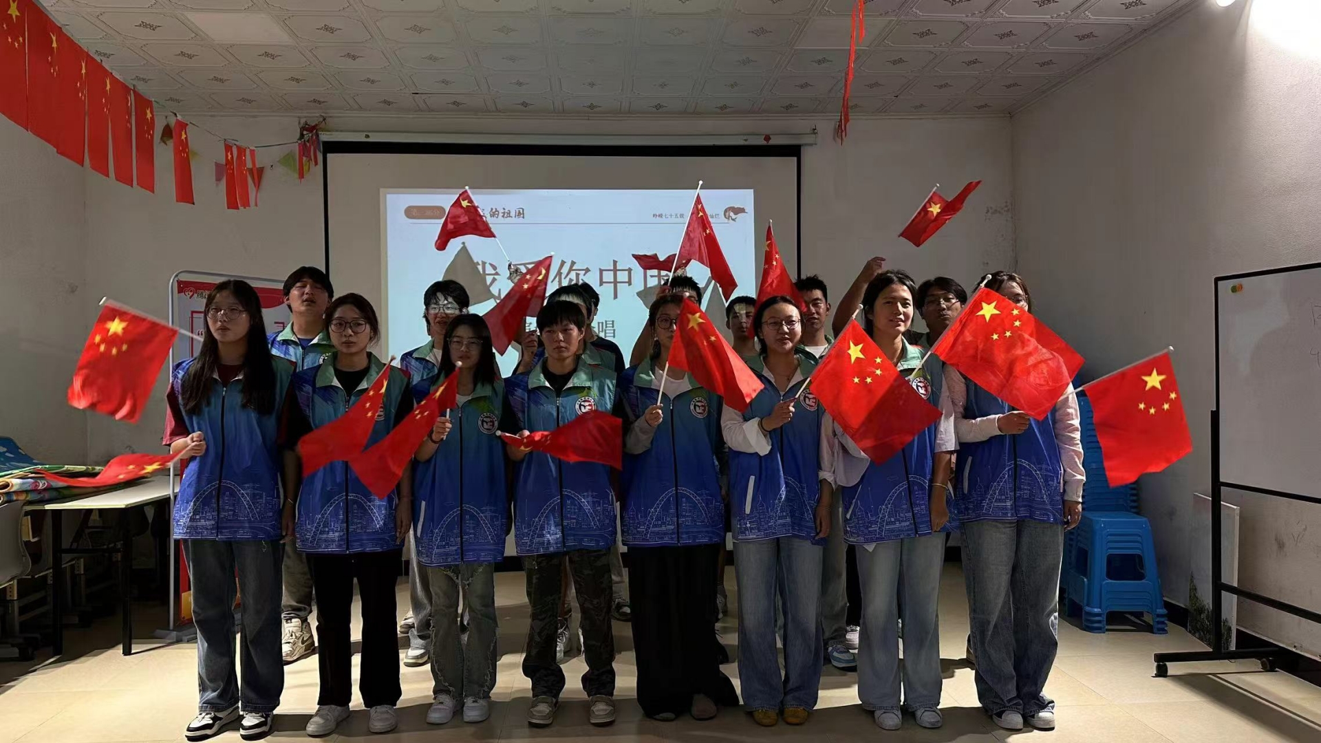 随后,汽车与机电工程系志愿者们与君子之家学员轮番上阵,带来了精彩的独唱节目。他们的歌声激昂高亢,每一个音符都饱含着对祖国的热爱与祝福,在大合唱《我爱你中国》中,学员们手持国旗和牌子,随着歌声的节奏挥舞,将现场气氛推向了顶点。这首歌曲不仅展现了学生们对祖国的深情厚谊,也传递了年轻一代的爱国热情与责任担当。