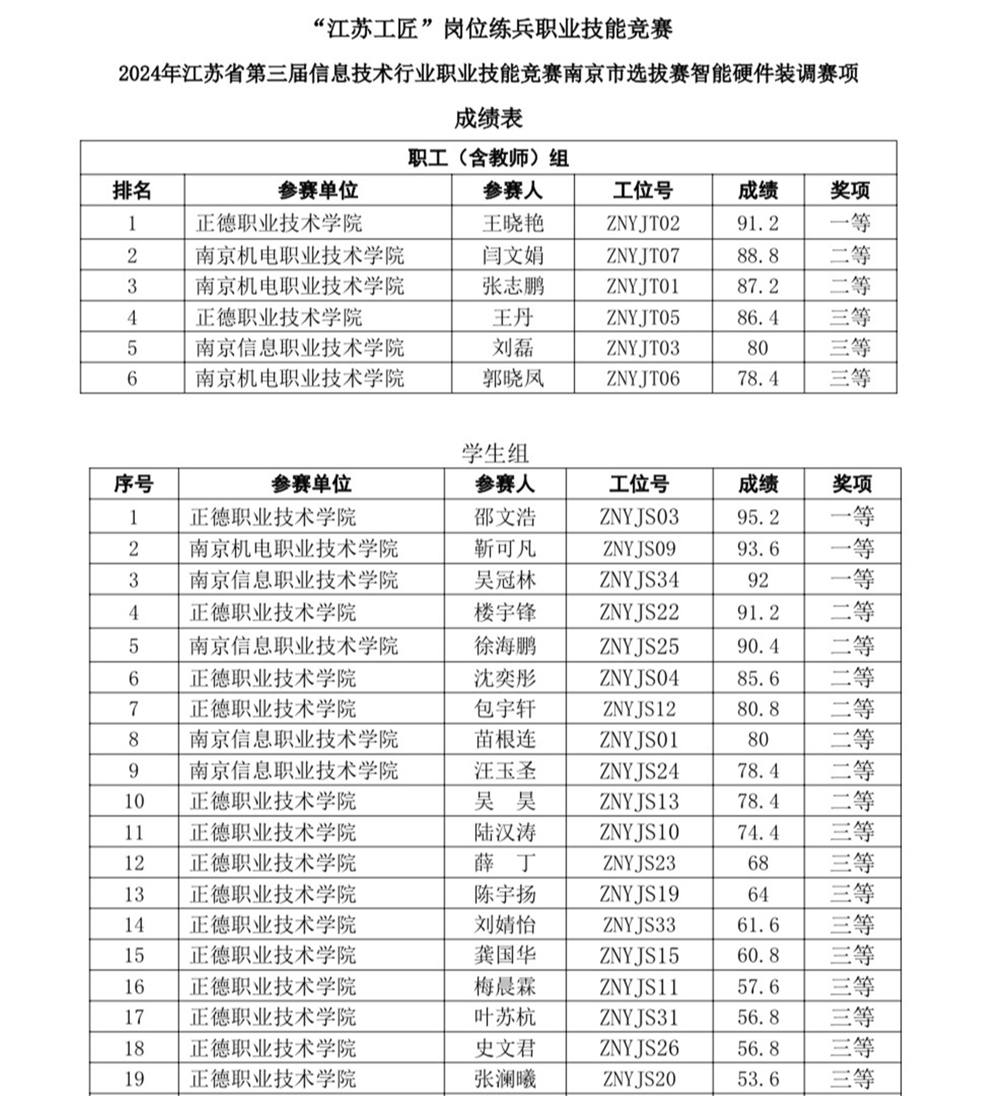 2024年10月13日,天博体育 电子与信息技术系师生在南京工业职业技术大学参加了“江苏工匠”岗位练兵职业技能竞赛活动——2024年江苏省第三届信息技术行业职业技能竞赛南京市选拔赛。经过激烈角逐,天博体育 代表队在智能硬件装调赛项中分别斩获教师组一等奖(第一名)1项、三等奖1项,学生组一等奖(第一名)1项、二等奖4项和三等奖9项。