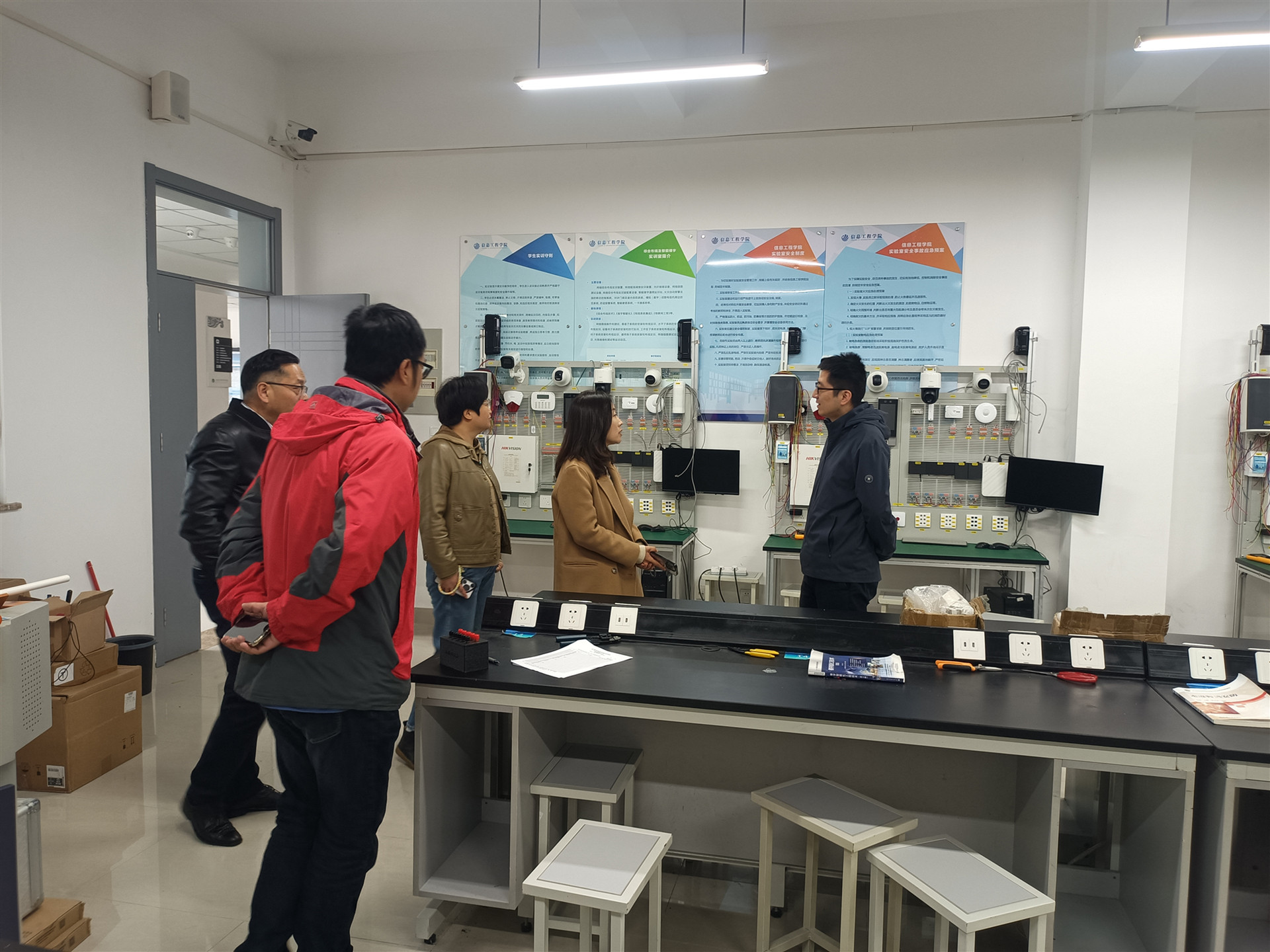 为深入推进专业建设,提升实验实训教学质量,强化学生实践创新能力培养,11月19日,电子与信息技术系主任刘佳、副主任张宝华、电子信息工程技术专业负责人戴慧及专任教师孙军辉等赴江苏农林职业技术天博体育 信息工程天博体育 进行调研学习。信息工程天博体育 党总支教工第一党支部副书记崔明、信息工程天博体育 物联网教研室专任教师仲瑶热情接待并全程陪同刘佳一行。