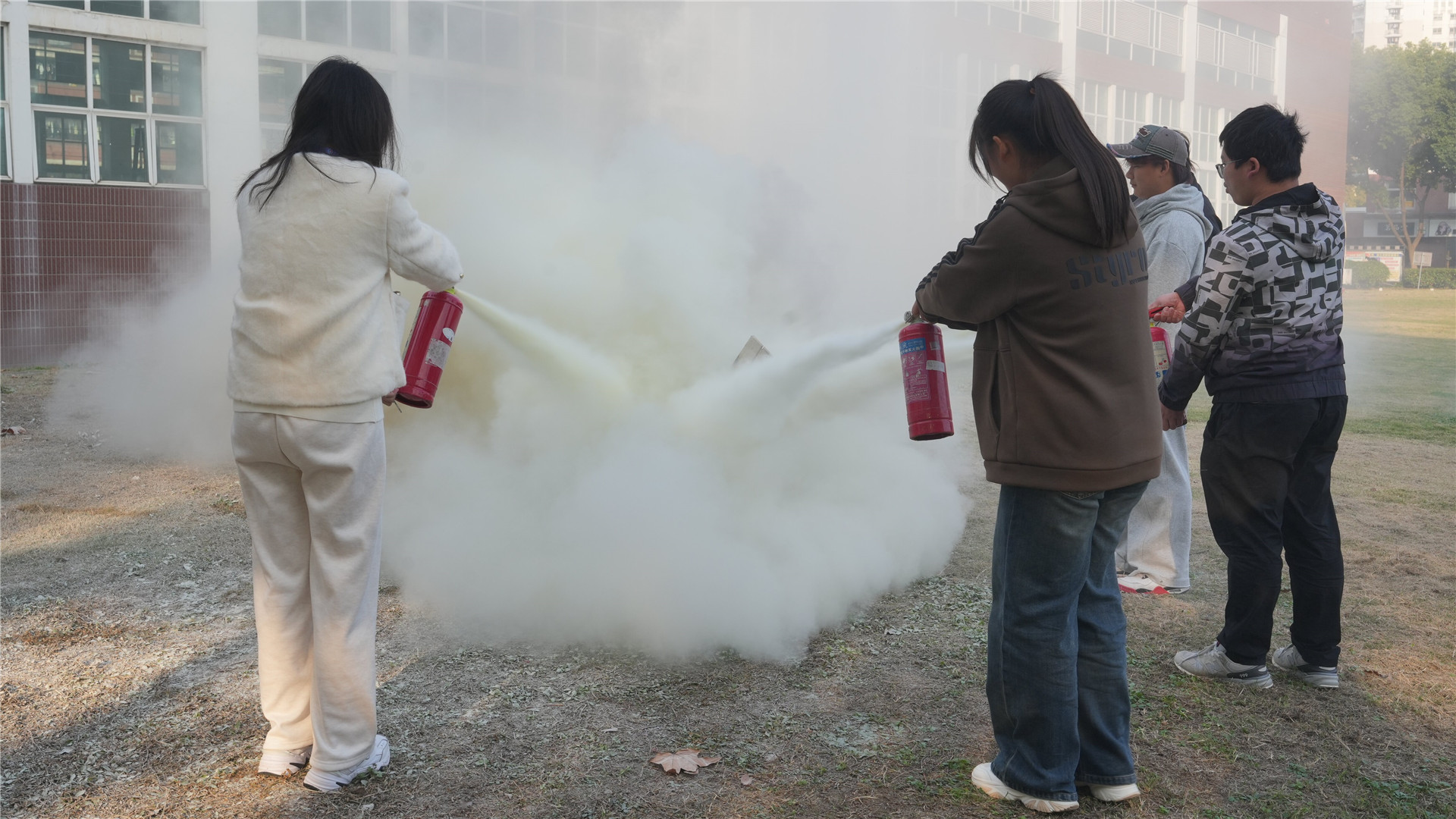 在消防员的指导下,师生员工体验了使用灭火器扑灭模拟火焰的操作,消防员就使用灭火器手势不正确、站位距离火源太近、灭火方向未对准火焰根部等实操过程中出现的问题进行了纠正。