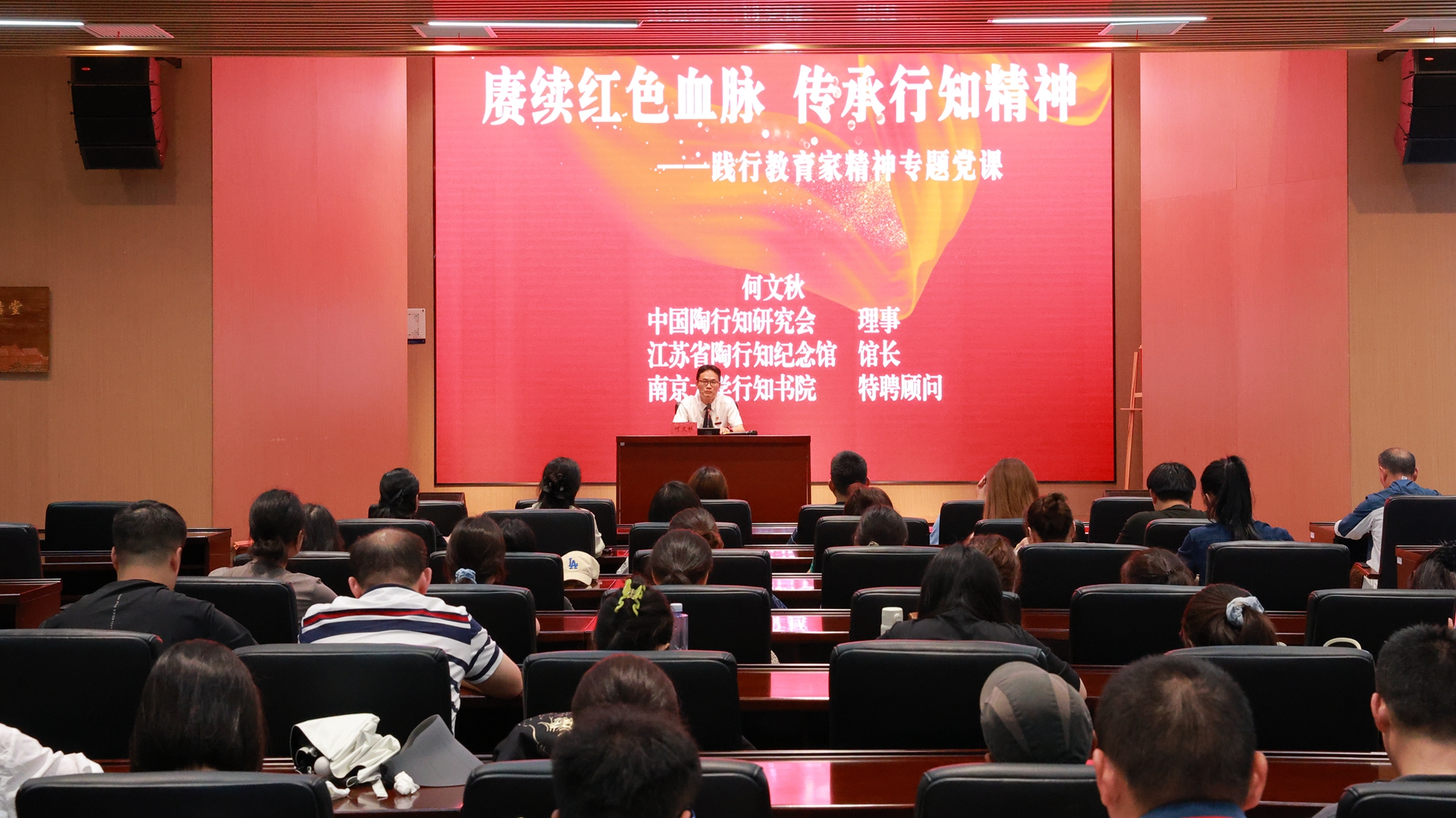 接着,南京晓庄天博体育 陶行知研究院党支部书记、江苏省陶行知纪念馆馆长何文秋,以其深厚的学术功底和丰富的实践经验,为大家带来了一场主题为“赓续红色血脉,传承行知精神”的专题党课。何文秋从陶行知先生“捧着一颗心来,不带半根草去”的教育誓言出发,系统解读了陶行知教育思想的核心要义,深入剖析了“生活即教育”“社会即学校”“教学做合一”三大理念的实践价值。他特别指出,陶行知先生的廉洁奉公、生活简朴精神,与新时代师德师风建设高度契合,是全体党员教师学习的典范。他呼吁全体党员教师以行知精神为镜,严守职业操守,杜绝教育腐败。他引用陶行知名言“千教万教教人求真,千学万学学做真人”,勉励教师们“以真为魂,以廉为基”,做学生成长路上的引路人。何文秋的党课内容丰富、思想深刻,使在场的每一位党员都深受启发。