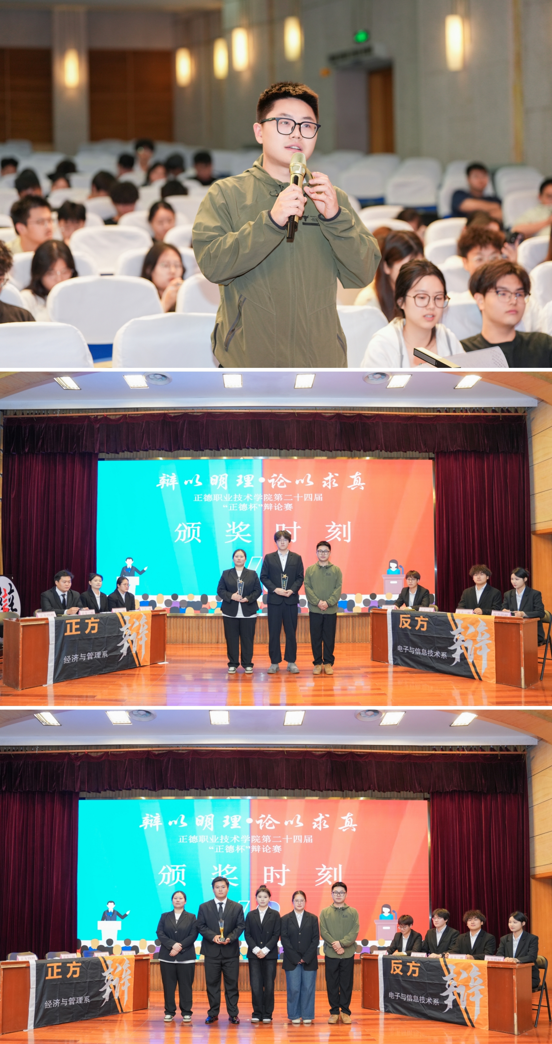 思辨激荡青春,智创赋能未来。 为丰富天博体育 文化生活,进一步提高学生的思辨能力、人文素养、综合素质,展现新时代大学生良好的精神风貌。5月28日晚,院团委在报告厅举办第二十四届“正德杯”辩论赛决赛。院团委书记黄晓帆、副书记魏兴彪出席比赛并担任评委,200余名学生共同观看比赛。