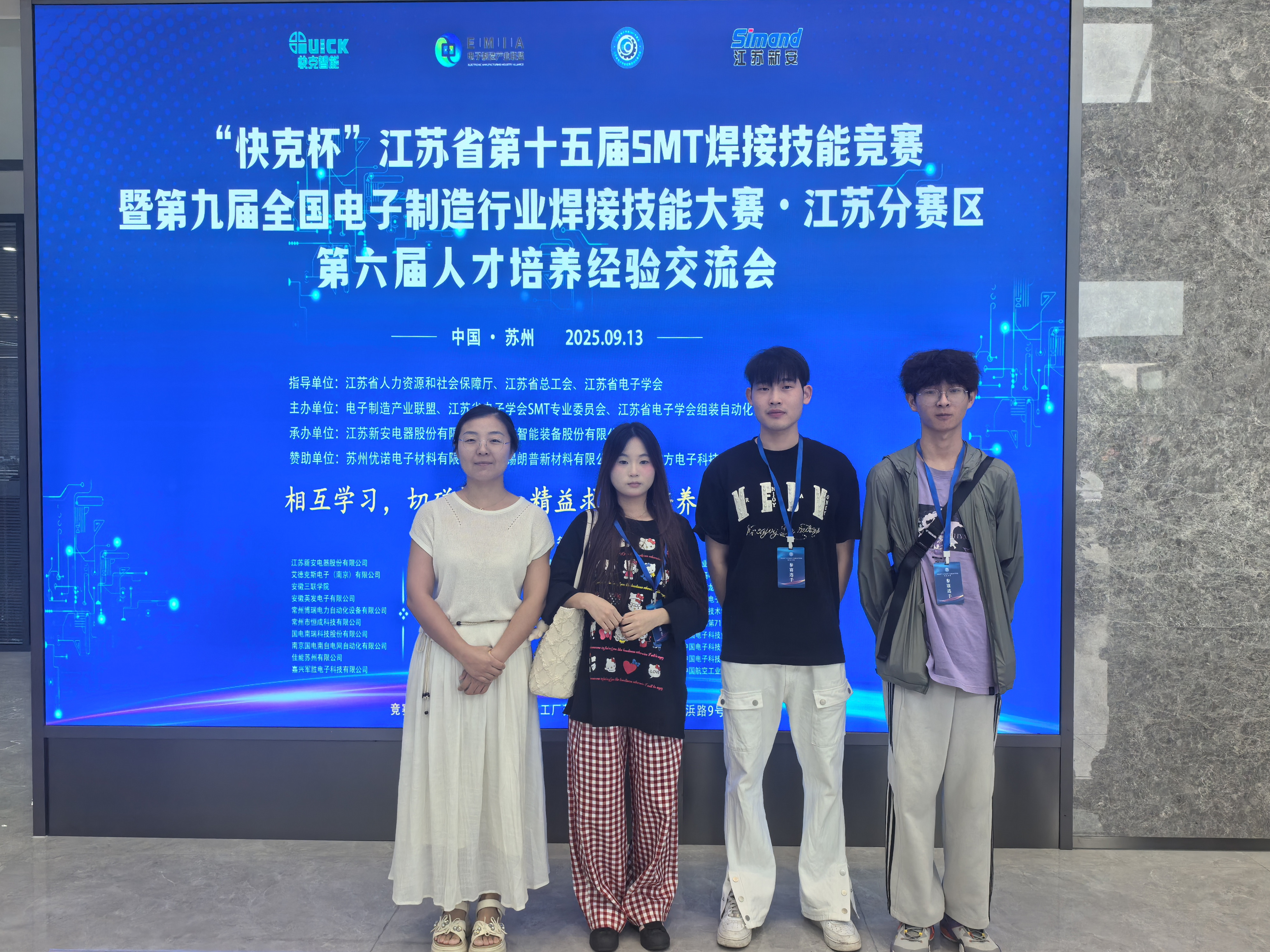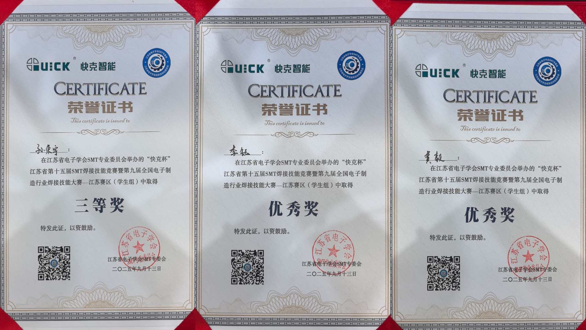 9月13日,“快克杯”江苏省第十五届SMT焊接技能竞赛在苏州成功举办。天博体育 电子与信息技术系孙荣宇、李钰、黄毅三名学生参赛,其中孙荣宇荣获三等奖,李钰、黄毅获优秀奖。