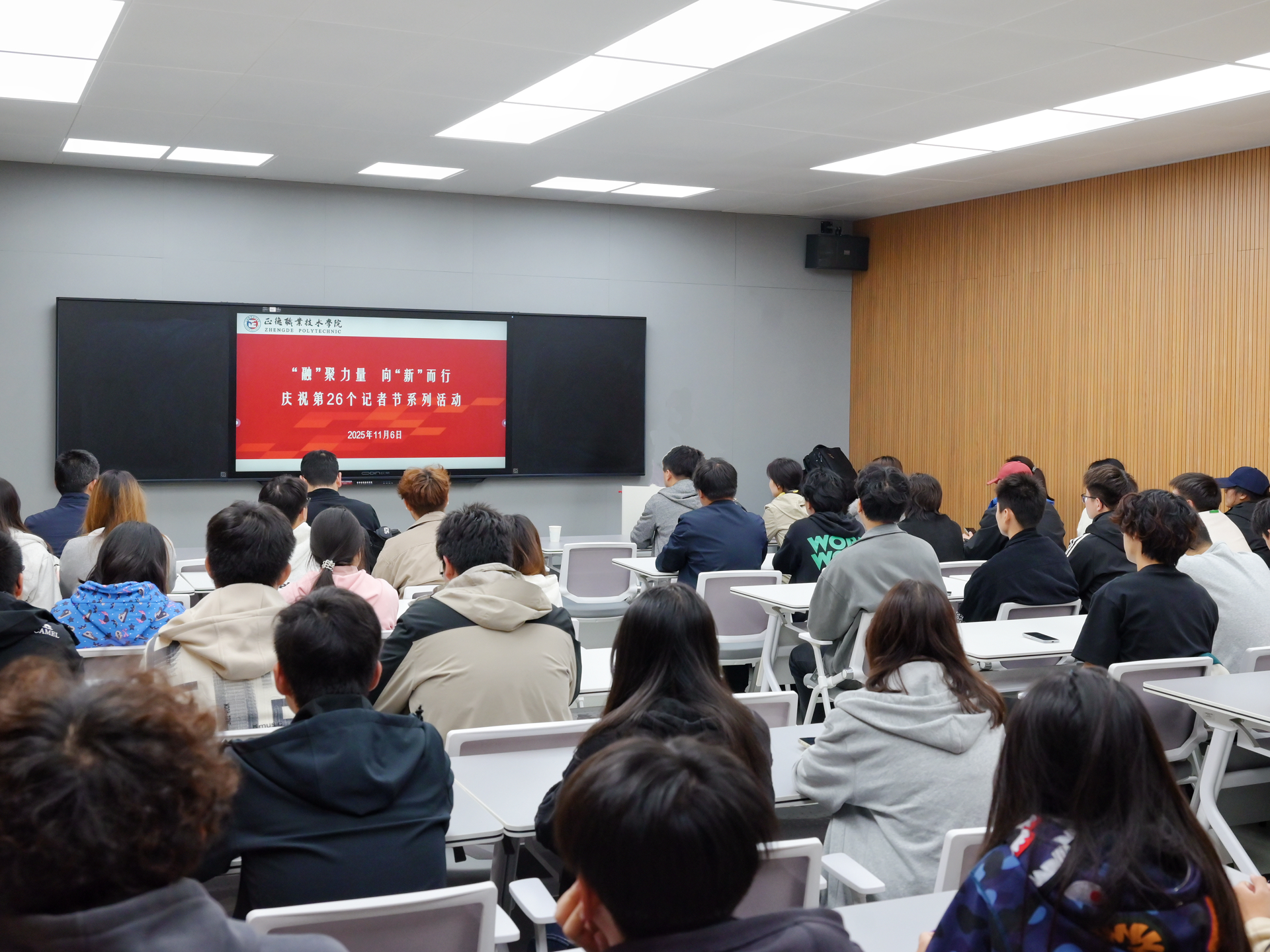 在第26个中国记者节来临之际,为展现天博体育 媒体人的风采,激发同学们的新闻理想与实践热情。11月6日,天博体育 党群工作部联合艺术设计与建筑工程系在9106教室举办“‘融’聚力量,向‘新’而行”记者节主题活动。活动特邀江苏省广播电视总台天博体育主任记者张正来天博体育 开展主题讲座。艺术设计与建筑工程系主任周卫、党群工作部部长祖国、艺术设计与建筑工程系教师葛雯和王子烜、院新媒体中心和融媒体技术与运营专业学生参加此次活动。活动由党群工作部副部长郑瑞主持。