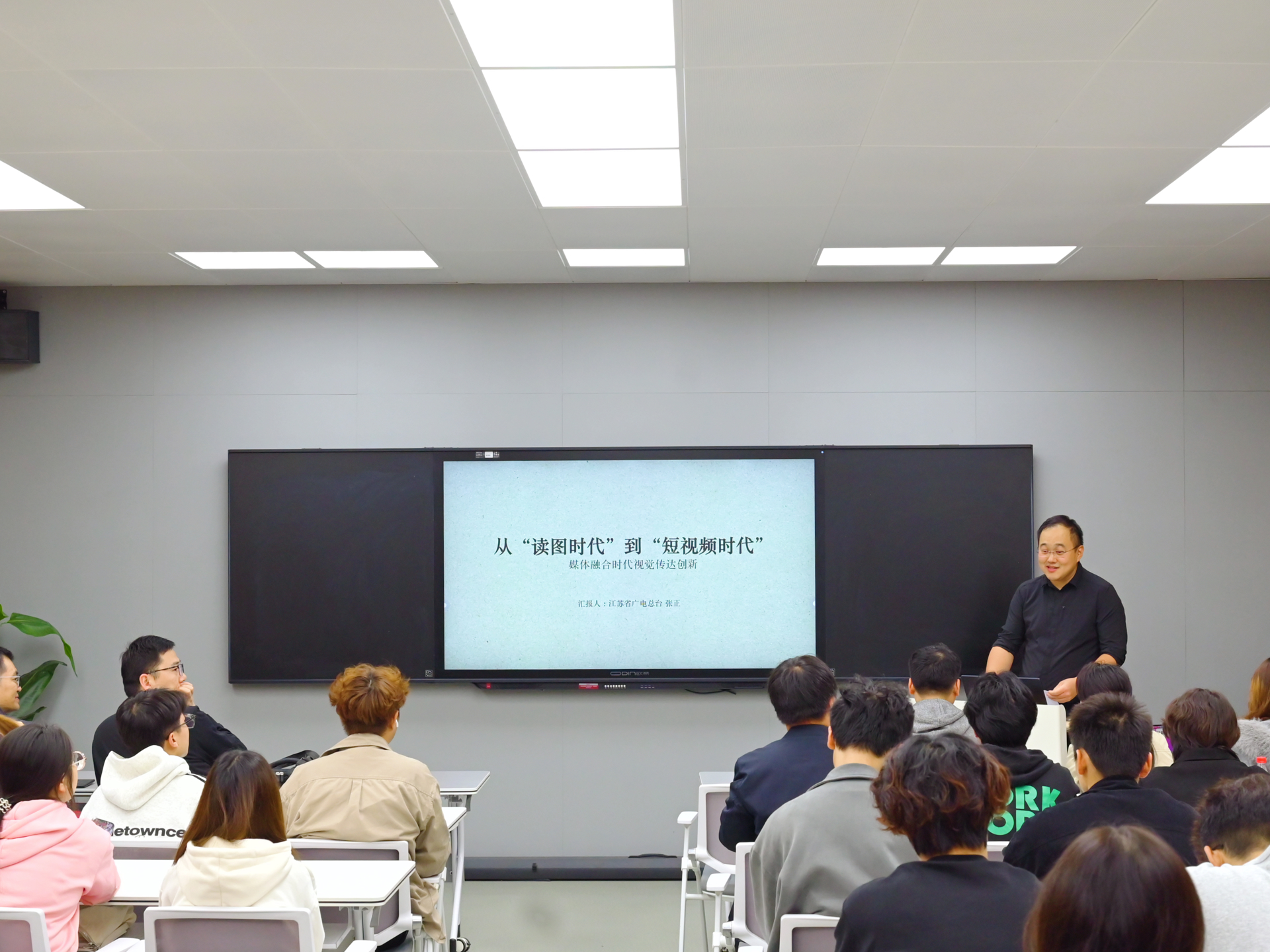 讲座中张正以“从‘读图时代’到‘短视频时代’——媒体融合时代视觉传达创新”为主题,通过摄影基础理论切入,详细拆解了关于相机的核心构成,以及镜头、成像介质、控制系统的工作原理与应用逻辑。同时针对“短视频时代”的创作热潮,从格式设置、调整色调、稳定使用设备等基础要求,到运镜、做好景别变化调整等方面的技巧提升,再到创意拍摄与剪辑的进阶方向,阐释了从“基础-提升-进阶”的视频拍摄要领。张正用丰富的真实案例与实践经验,深入浅出地剖析如何创作出优质的短视频。