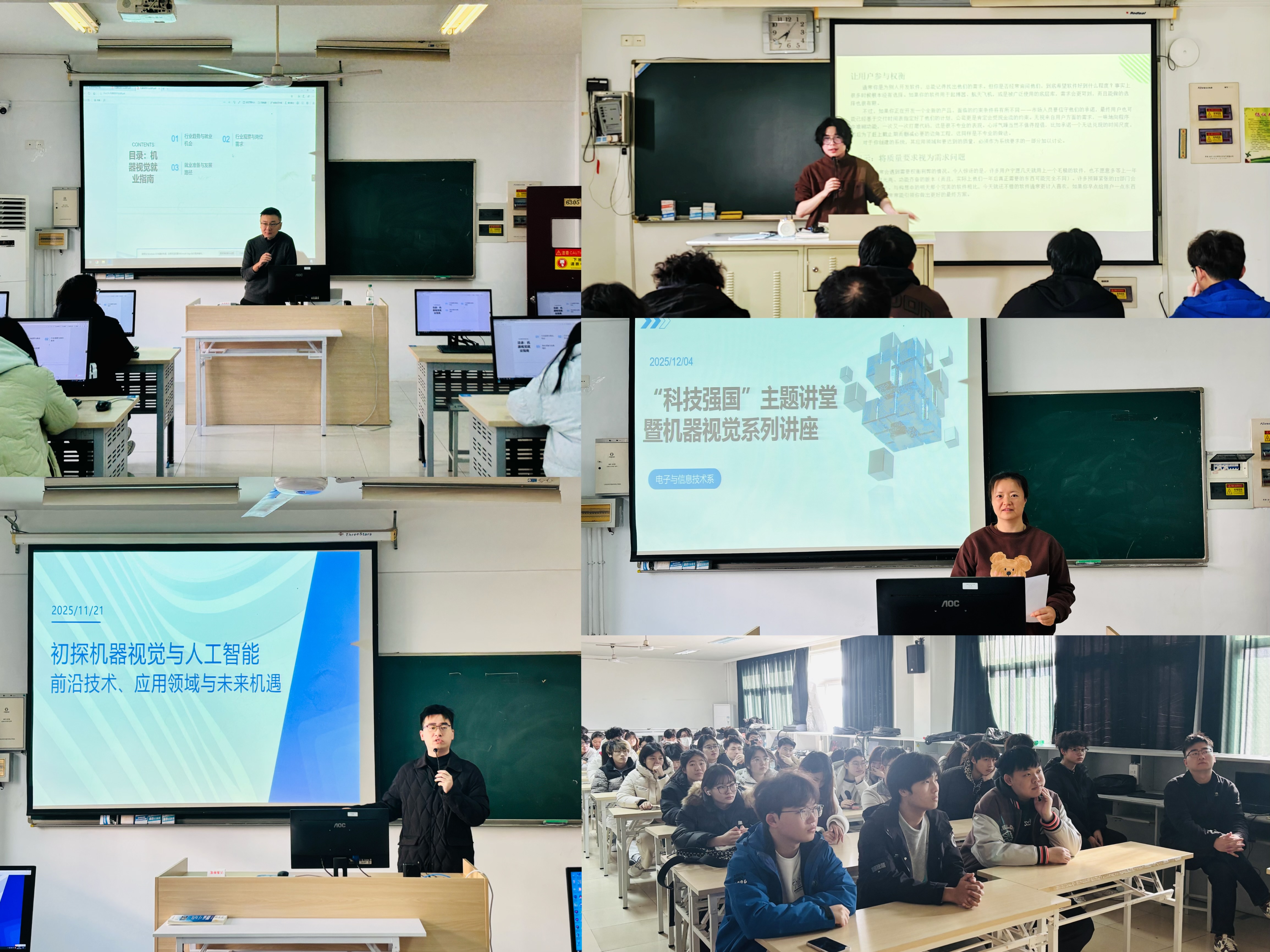 为精准对接新质生产力需求,将“科技强国”信念融入专业教育,提升学生专业技术视野与职业规划能力,2025年11月至12月,电子与信息技术系联合南京南暄禾雅科技有限公司(以下简称南暄禾雅)成功举办“科技强国”主题讲堂暨机器视觉系列讲座。12月29日,随着最后一场讲座的结束,历时一个多月的系列活动圆满收官。
