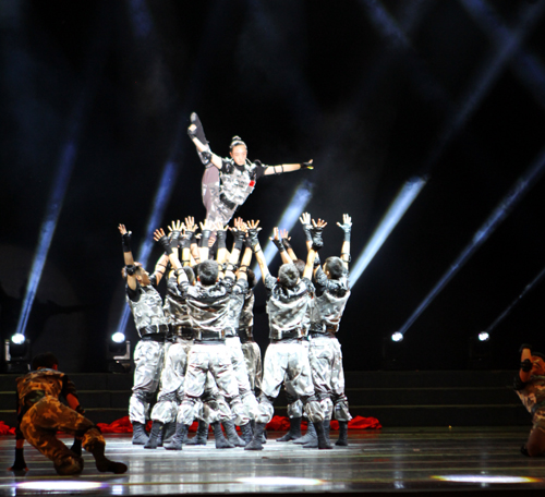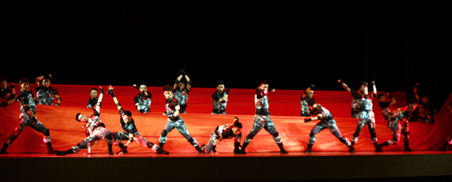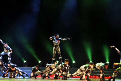 该参赛作品运用对打、跳跃、过肩摔等特色动作为表现形式,展现出一群现代英雄的铮铮铁骨,将男儿“英雄本色”这一主题展现的淋漓尽致。天博体育 大学生艺术团28名男生在基础部刘翔老师的指导下,刻苦训练,精雕细刻,比赛中,同学们凭着整齐划一,刚劲硬朗的风格打动了评委和观众,终于获得丰厚的回报。