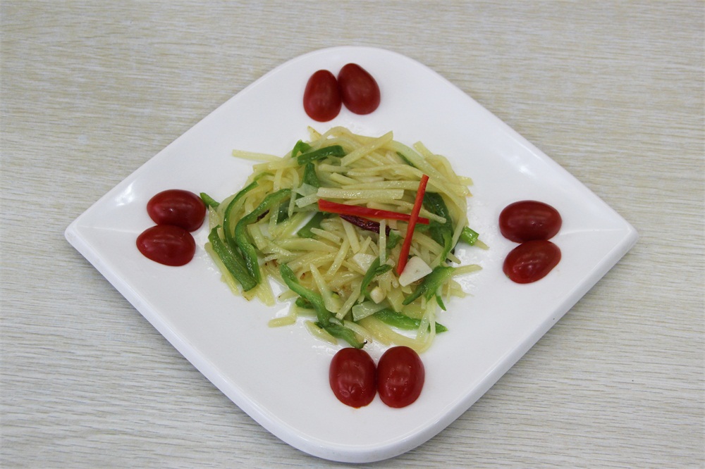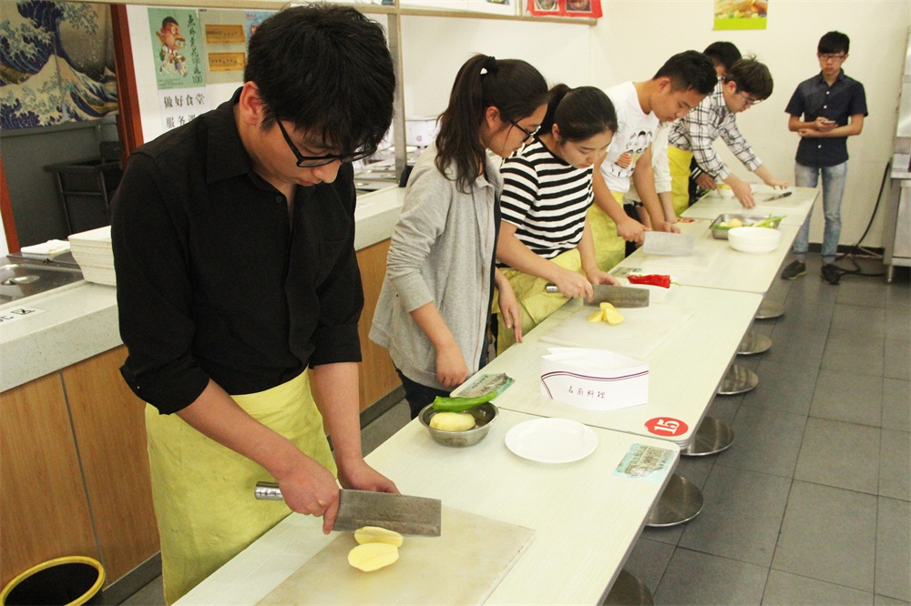 六支队伍分两轮进行比赛共制作两道菜品,“规定菜”要求选手根据主办方提供的主材料土豆以及自行选择辅料制作一道菜品,“特色菜”选手可自由发挥,做一道家乡菜。比赛一开始,选手们便开始有条不紊地忙碌起来,洗、切、剁、拍,各个显得像模像样,引得观赛同学纷纷赞叹。厨房锅重火大与家庭中使用的灶具有所不同,炒制过程中,选手们配合默契,精心烹饪,不一会一道道色香味美的菜肴便纷纷亮相。