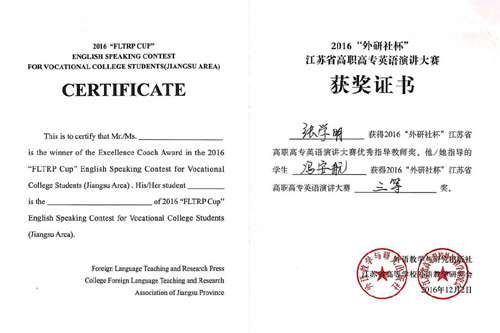 12月3日,历时两天的2016年“外研社杯”江苏省高职高专英语演讲大赛在江苏城市职业天博体育 落下帷幕。天博体育 民用航空系空中乘务专业冯安航同学荣获三等奖,基础部张学明老师荣获优秀指导教师奖。