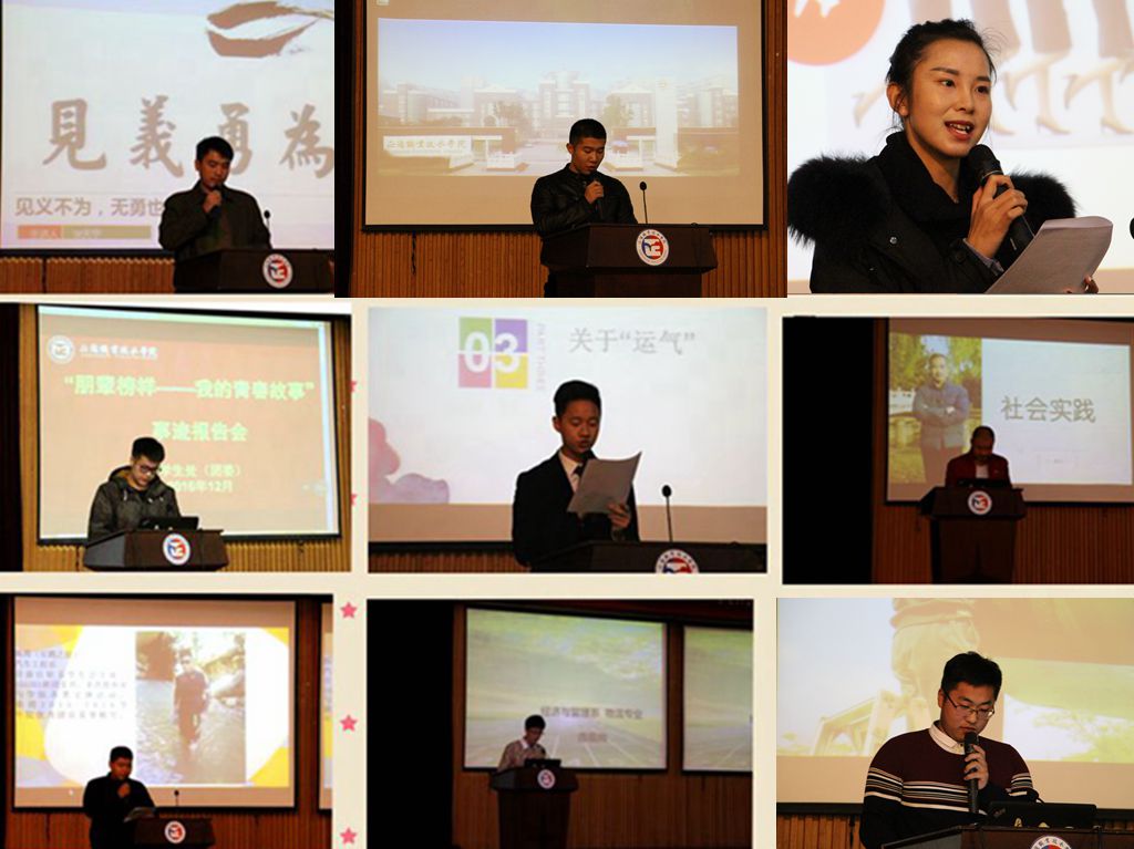 参加事迹报告会的讲述人有职业规划之星高沛君,陈袁帅,朱倩文,王怡超,他们用参加职业规划大赛的心路历程,告诉大家职业规划如何点亮未来。学习之星程志豪、范音豪、李佳颖则用切身经历展现了目标对于大学学习的重要性,告诉大家要珍惜大学时光好好学习,技多不压身。刘天煜、韩浩、陈涛和大家分享了他们在学生工作、志愿服务、岗位实习等活动中的经验与收获。李鹏远则以他对五字教育中“责”“毅”的理解作为切入口,告诉大家责任、毅力的重要。报告人中还有乐于助人的张恩瑾,见义勇为的毕天宇,他们用勇气与热心诠释了新时代平凡又不平庸的好青年形象。