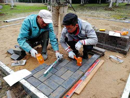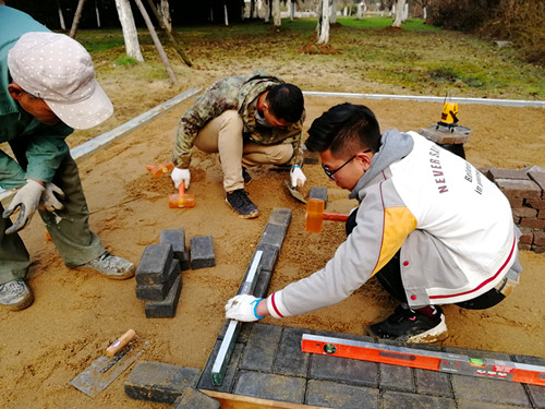 2018年1月发文的江苏省职业技能大赛通知中,园林景观比赛更改了往年的大赛规则:由单独一项设计比赛增加施工比赛,共两项。比赛时间由之前4小时增加到15小时。比赛规则的改变,对参赛学生专业素质至身体素质都是严峻挑战,但不论指导教师还是学生践行着不忘初心:大赛指导团队迅速调整训练计划,增选施工队员。积极向天博体育 申请施工备赛场地,在天博体育 各级领导的关怀和指导下,2018年3月开学初,施工训练场地准备齐全,学生开始施工比赛训练。