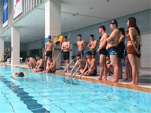 为不断深化文化育人新模式,增强同学们体质,打通师生间心灵的纽带,机电工程系副主任毛茂、团总支书记李浩文及教师代表一行,带着他们的学生正在这里进行着一场别开生面的导师制活动。在下水之前,原江苏游泳队国家一级运动员、现南京全民健身中心培训部虞经理专门为同学们进行了水上安全、游泳技能基础培训。培训之后,同学们开始自由练习,愉快地体验着游泳带来的乐趣。