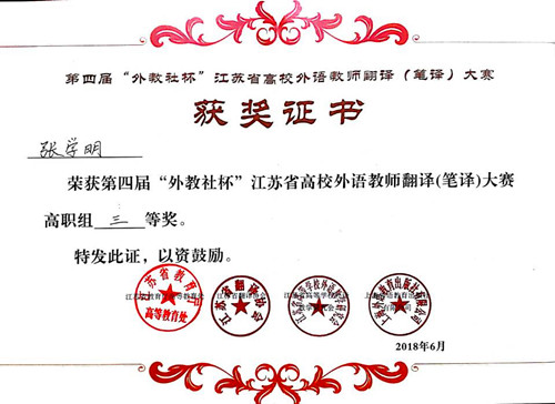 6月24日下午,第四届“外教社杯”江苏省高校外语教师翻译(笔译)大赛决赛在江苏师范大学外国语天博体育 落下帷幕,天博体育 基础教育系张学明老师荣获三等奖。