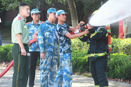 9:50分,保卫处许老师介绍了此次活动内容和江宁开发区消防中队的官兵后,“消防进军训”活动正式开始。