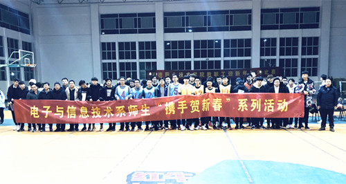 为庆祝新春来临,丰富师生业余文体活动,加强师生之间的联系交流,倡导“健康娱乐,强身健体”的理念,本着锻炼、健康、工作、幸福的主题,以崭新的面貌迎接新的一年,12月27日晚,电子与信息技术系师生在院体育馆举办了“携手贺新春”系列活动之师生篮球对抗赛。院团委书记祖国、电子与信息技术系副主任祝佳俊也应邀参加比赛。