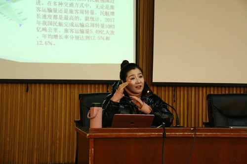 宣讲会先由曾服务于深圳航空8年的马艳老师给同学们做了航空服务类公司的培训介绍。马艳从她自身空姐做到乘务长的经历开始,从职位到面试再到职业发展规划,详细生动地向同学们展示了航空公司的各项业务以及培训要求,让同学们对航空服务类岗位有了更直观的认知。其次,由南京艺术天博体育 吴立平教授,简明通俗地向同学们展示了会展公司的要求以及培训要求,让同学们对新媒体以及会展有了更形象具体的了解。