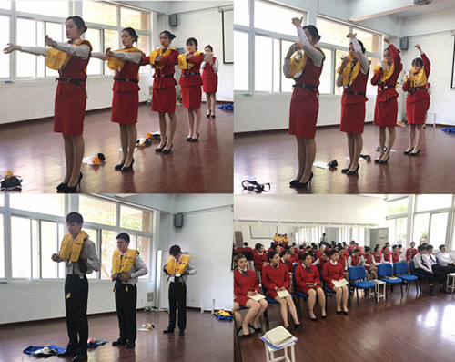 在专业老师的讲解下,同学们学习了安全演示项目中的理论知识及演示安全设备的方法。在学习的过程中,同学们积极,热情,认真。课上每位同学都进行了安全演示,对如何使用救生衣、氧气面罩、安全带、指示应急出口、应急指示灯及阅读安全须知卡都有了深刻的理解,并熟练掌握了应急设备的演示。