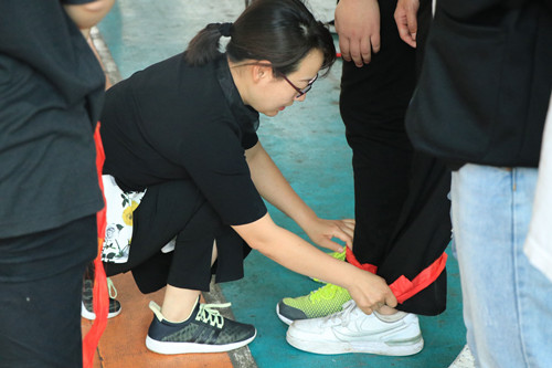 导师为学生系丝带,准备“五人六足”比赛