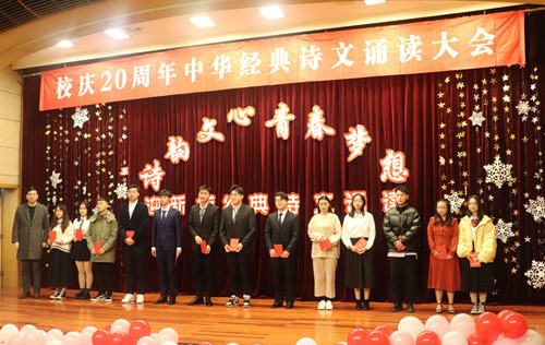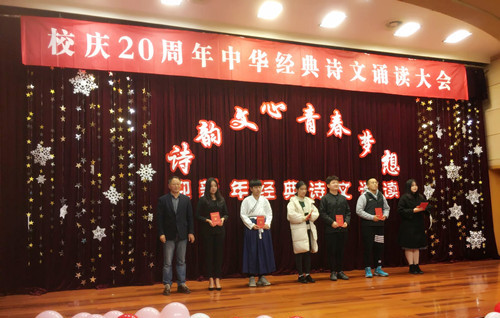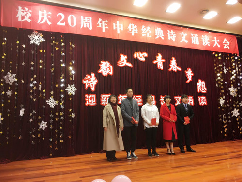 12月25日下午,天博体育 举行“诗韵文心 青春梦想”中华经典诗文诵读大会。国家级普通话水平测试员、电视台资深主播周敏燕教授,学生处处长李秀成、副处长祖国及基础教育系汪小艳副教授担任评委。基础教育系主任杨卫东出席活动,各系学生代表到场观摩。