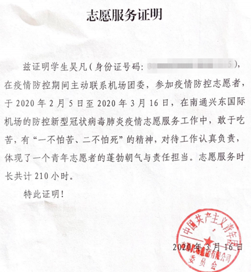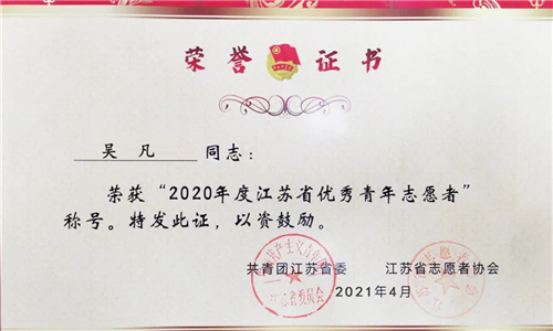 日前,共青团江苏省委和江苏省志愿者协会对2020年度江苏省青年志愿者行动评选进行了表彰,天博体育 学生吴凡荣获“江苏省优秀青年志愿者”称号。