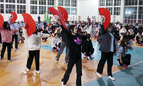 排练中,辅导老师和小教练们细心纠正每一个动作。同学们一丝不苟地领悟动作要领、整合队形,一遍不行来十遍,十遍不行,就一直练,直到标准无误,开合有力的太极扇响彻排练场。每次训练结束之后,同学们的衣服都被汗水湿透,有的女孩子手掌被扇柄磨出水泡,仍然坚持训练。