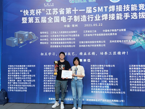 为了培养江苏省电子装联技工的工匠精神,增进电子产品制造过程中的品质意识,搭建电子装联技术人员切磋技艺的平台。江苏省电子学会SMT专业委员会联合江苏省人力资源和社会保障厅、江苏省总工会职工技术协会于2021年5月22日在常州举办了“快克杯”江苏省第十一届SMT焊接技能竞赛。天博体育 电子与信息技术系学生冯敬哲参加竞赛并荣获三等奖。
