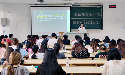 为进一步推进2019级学生“2+1”顶岗实习工作,动员学生在即将到来实习中做好各项准备,基础教育系于6月9日下午在1102、1103教室分别召开了两场2019级顶岗实习动员大会。基础教育系主任詹勇虎、副主任杨卫东出席,专业负责人汪小艳、辅导员吴美仪和吴春凤以及该年级300余名学生参加了动员大会。动员大会由杨卫东主持。