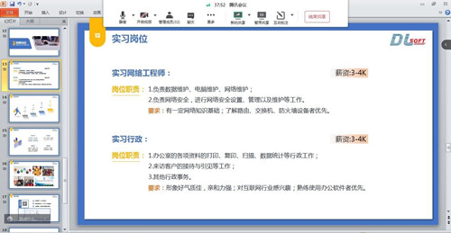 招聘会吸引了2019级计算机网络技术、计算机应用技术和软件技术三个专业的学生参加 。江苏东蓝软件技术有限公司人事经理孔海燕在腾讯会议上用ppt向学生们介绍了公司的基本概括、天博体育、企业精神和工作环境等内容,针对此次招聘的岗位要求、薪资待遇和职业发展前景进行了详细阐释,并在线上及时为同学们解答疑问,招聘会在愉快的氛围中结束。