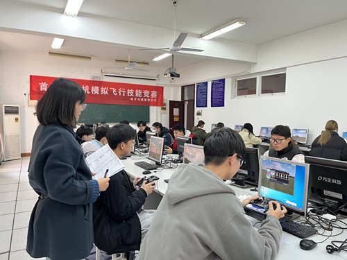 本届无人机模拟飞行竞赛主要考验学生对无人机模拟飞行的操纵控制能力和应变处理能力,用计算机模拟操控无人机“刺气球”的方式来计分,在规定的时间内刺破气球数量越多得分越高。现场气氛紧张激烈,学生们沉着冷静,积极应对比赛。