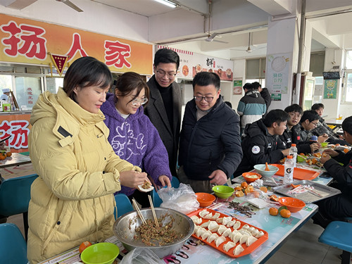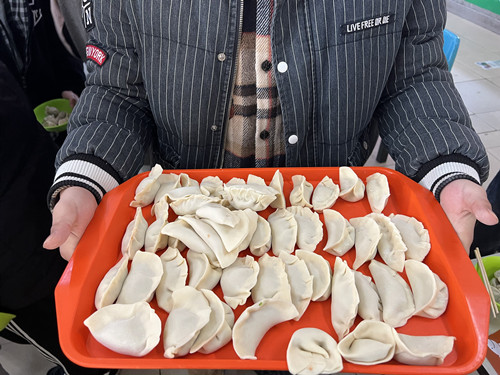 活动伊始,王高山向全体师生表达了新年的祝福,希望同学们在新的一年里学习进步,健康快乐的成长;祝福全体教师工作顺利、家庭美满。随后师生们在一起畅聊一年来的学习生活和明年的打算。期间,同学们的热情很高,调肉馅,包饺子,随着同学们的努力,一个个奇形怪状的饺子出来了,不会包的向会包的学习,渐渐也能熟练地包出来漂亮的饺子,大家都有说有笑,分享包饺子的经验,交流学习心得,场面十分热闹。