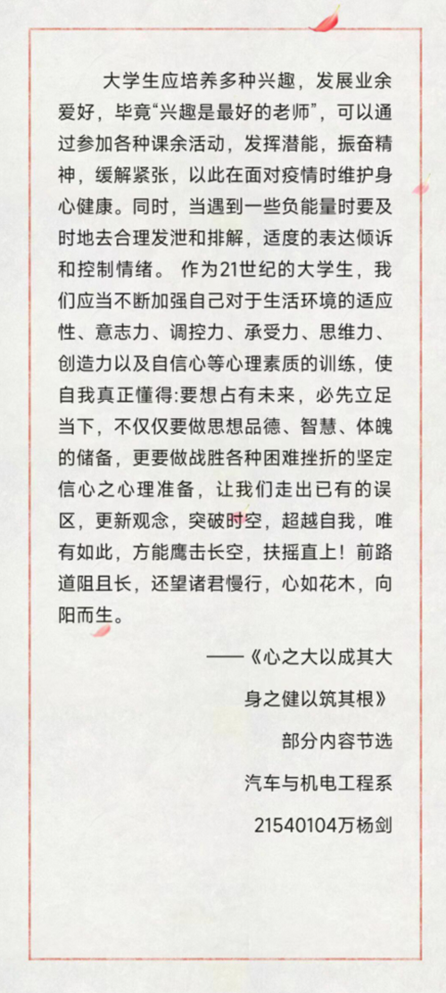“向阳携行,共创未来”首届心理征文比赛活动到此圆满结束,在疫情防控期间天博体育 将一如既往加强大学生心理健康教育建设,坚持“育人”“育心”相统一,激励同学们齐心协力,勇往直前。