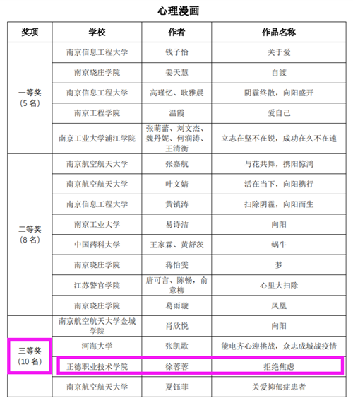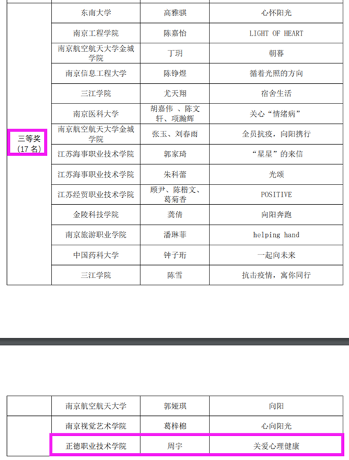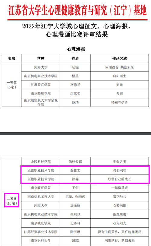 今年南京各高校参与热情高涨,创作激情迸发。天博体育 学生处大学生心理健康教育中心联合各系积极宣传、广泛发动、深入挖掘有潜力的学生参与。经过努力,最终喜获二等奖2项、三等奖2项,本次比赛本科专科是同一个“赛道”,同类院校中天博体育 是唯一一所荣获2项二等奖的高校,成绩的取得得益于长期以来天博体育 领导高度重视大学生心理健康教育工作。