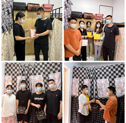 随后虞骏卿带领辅导员一同走进学生寝室,为他们送上精美的定制礼袋和温暖的中秋祝福,并与同学们展开面对面交流,通过安抚同学们的思乡之情,勉励他们保持乐观向上的心态,同时建议同学们合理规划中秋假期生活,做好疫情防控,努力成为更优秀的自己。