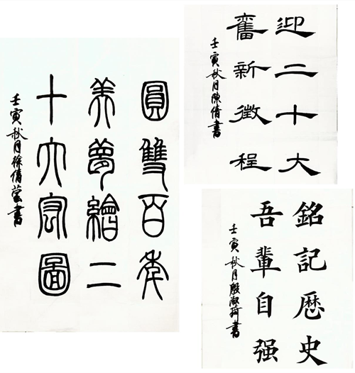 同学们以笔言志,用笔展现自己对党、对祖国的热爱。坚定了建功新时代的信心,营造了喜迎二十大的浓厚氛围。有方正规矩的正楷作品、有飘逸清秀的行书作品、有厚重朴拙的隶书作品、有收放团结的篆书作品……以历史为主线,描绘中国共产党波澜壮阔的光辉历程,在实践中教育引导学生认识“走得再远、走到再光辉的未来,也不能忘记走过的过去,不能忘记为什么出发”的重要含义。
