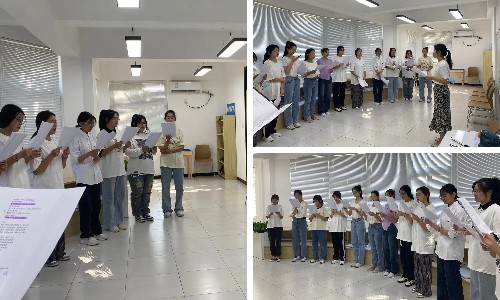 二楼的活动室里,胡娜老师结合朗诵作品《与时代同向,与祖国同行》,从多个方面为大家讲解了普通话和朗诵的技巧,针对同学们在朗读中存在的断句太碎、拖腔甩调等问题进行了分析和指导,并亲自示范,一字一句,句句关情。同学们在老师的带领下以诗抒怀,放情讴歌,表达出了她们对党和国家的热爱之情和迎接党的二十大胜利召开的喜悦心情。