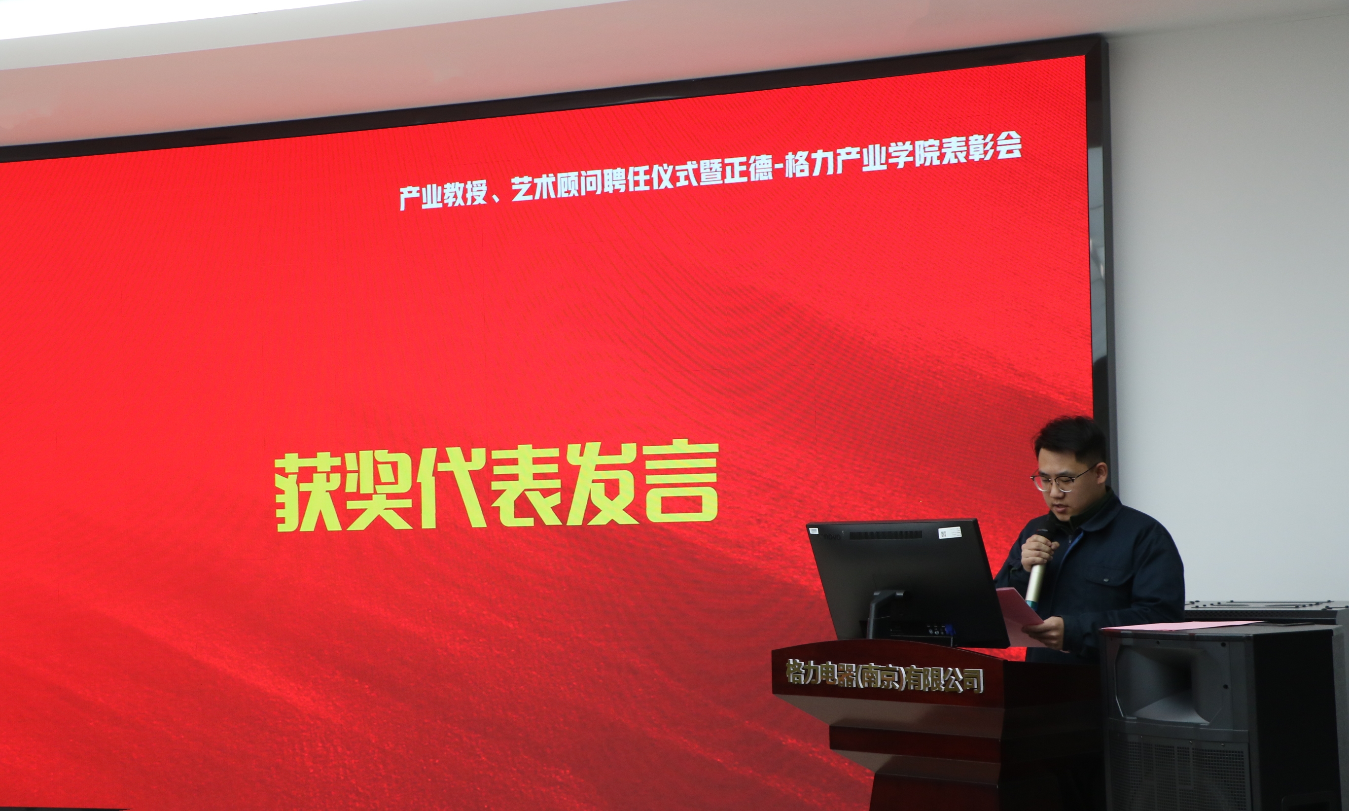 “突出贡献奖”获奖代表、电子与信息技术系副主任(主持工作)刘佳表示,格力电器开放包容、严谨务实的天博体育是校企合作顺利落实推进的重要基础,在产业天博体育 成长的两年中,双方在人才培养、专业建设、课程建设等方面取得显著成效,希望在校企共同努力下尽快把正德-格力产业天博体育 建设成为集人才培养、技术创新、社会服务功能于一体的现代产业天博体育 。“优秀实习生”获奖代表胡伟感谢学校和企业提供的发展机遇和优质平台,结合自己的工作岗位和职责,分享了其在格力公司岗位实习期间的收获和进步。
